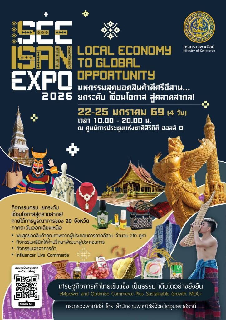 มหกรรมสุดยอดสินค้าดีศรีอีสาน “SEE ISAN EXPO 2026” จัดโดยกระทรวงพาณิชย์ โดยสำนักงานพาณิชย์จังหวัดอุบลราชธานี โชว์ศักยภาพนานาสินค้าจาก 20 จังหวัดภาคอีสาน รวมถึง 4 จังหวัดที่ได้รับผลจากการปะทะบริเวณชายแดนไทย-กัมพูชา รวม 210 คูหา ระหว่างวันที่ 22–25 มกราคม 2569 ณ ฮอลล์ 8 ชั้น LG ศูนย์การประชุมแห่งชาติสิริกิติ์ กรุงเทพมหานคร เปิดให้เข้าชมฟรีทุกวัน เวลาระหว่าง 10.00–20.00 น. ทัพสินค้าทุกหมวดแสดงศักยภาพของนวัตกรรม การสร้างมูลค่าเพิ่ม ต่อยอดจากอัตลักษณ์และภูมิปัญญาของถิ่นอีสาน ด้วยกระบวนการการผลิตที่คำนึงถึงสิ่งความยั่งยืน และตอบโจทย์ความต้องการของตลาดไทยและตลาดโลก
