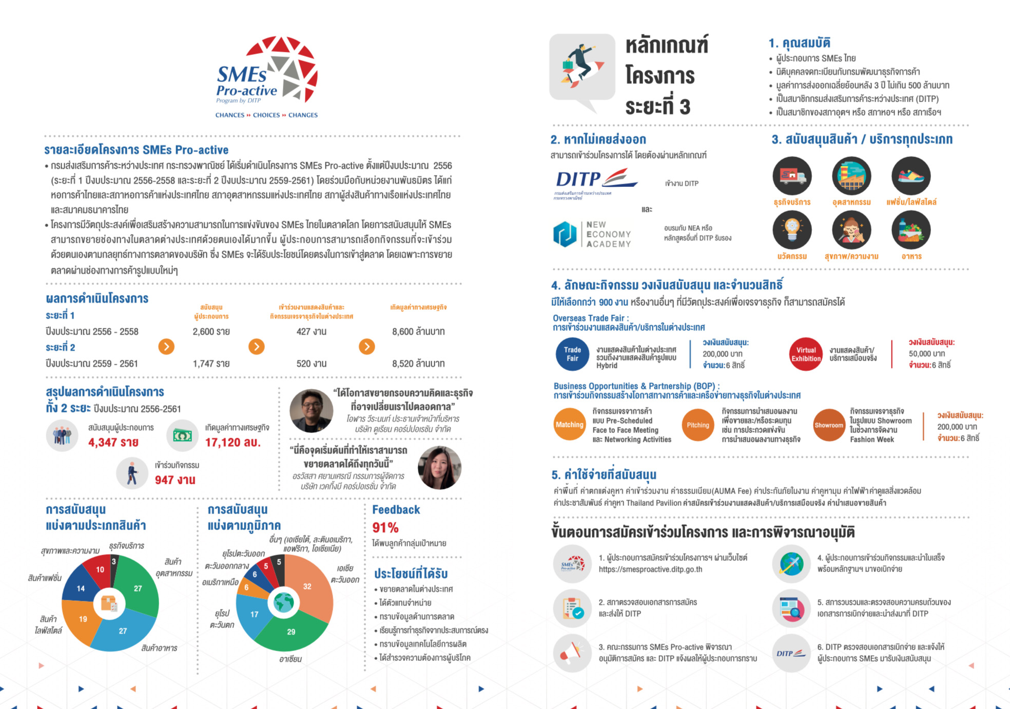 ที่ปรึกษารัฐมนตรีว่าการกระทรวงพาณิชย์ กล่าวว่า กิจกรรมที่จะสนับสนุนครอบคลุมทั้งการเข้าร่วมงานแสดงสินค้า บริการในต่างประเทศ (Overseas Trade Fair) กิจกรรมสร้างโอกาสทางการค้าและเครือข่ายทางธุรกิจในต่างประเทศ (Business Opportunities & Partnership : BOP) และงานแสดงสินค้า บริการเสมือนจริงในต่างประเทศ (Virtual Exhibition) โดยประเภทสินค้าที่ได้รับการอนุมัติมากที่สุด 3 อันดับแรก ได้แก่ สินค้าไลฟ์สไตล์ สินค้าอุตสาหกรรม และสินค้าอาหาร โดยเป็นกิจกรรมในประเทศแถบภูมิภาคอาเซียนมากที่สุด รองลงมาเป็นประเทศแถบภูมิภาคเอเชียตะวันออก