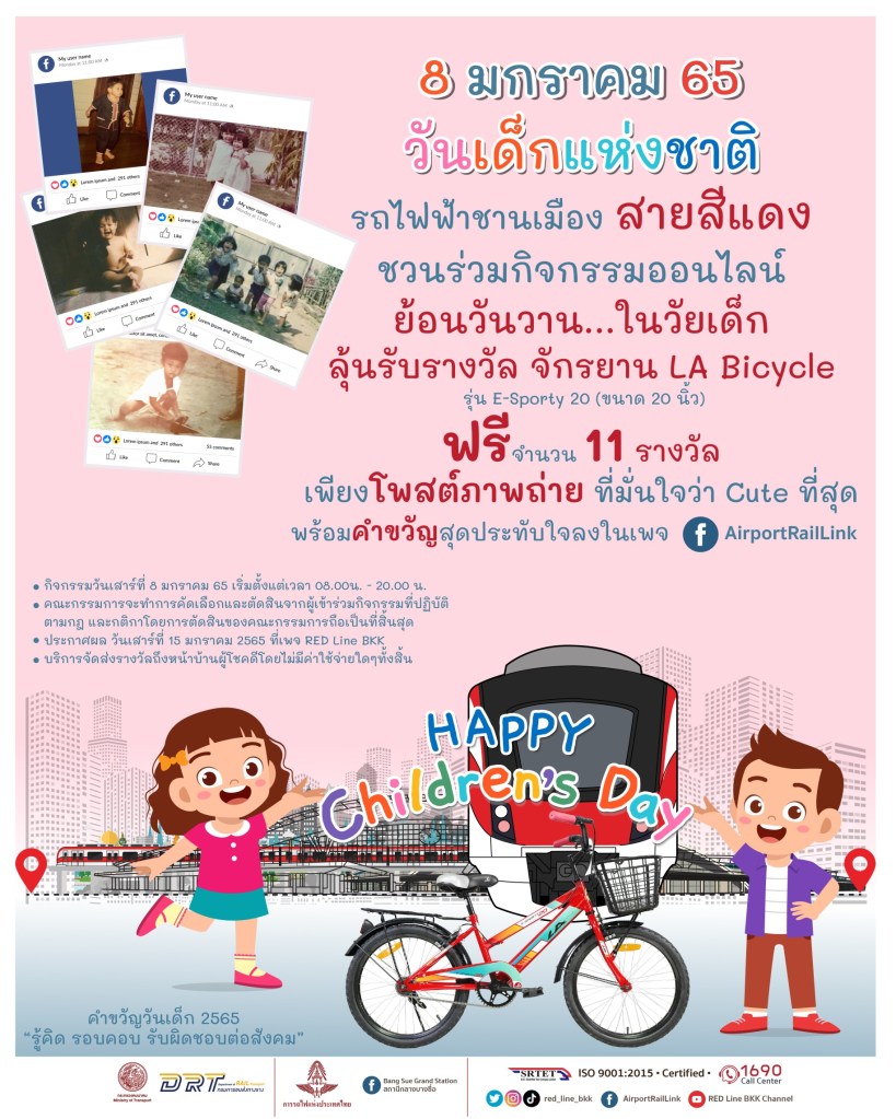 นายสุเทพ พันธุ์เพ็ง กรรมการผู้อำนวยการใหญ่ บริษัท รถไฟฟ้า ร.ฟ.ท. จำกัด ผู้ให้บริการรถไฟฟ้าชานเมืองสายสีแดง เปิดเผยว่า ตามสถานการณ์ปกติเมื่อถึงช่วงวันเด็กแห่งชาติในแต่ละปี บริษัทจะมีการจัดกิจกรรมการตลาดเพื่อส่งมอบความสุข และสร้างรอยยิ้มให้แก่เด็กๆ และผู้โดยสารมาโดยตลอด ทว่าในปีนี้ด้วยสถานการณ์การแพร่ระระบาดของไวรัสโควิด-19 ที่กำลังมีแนวโน้มกลับมาเพิ่มสูงขึ้นในปัจจุบัน บริษัทจึงได้ปรับรูปแบบการจัดกิจกรรมการตลาดจากเดิมที่เป็นการจัดกิจกรรมแบบออฟไลน์ เป็นการจัดกิจกรรมส่งเสริมการตลาดในรูปแบบ “ออนไลน์” แทน ด้วยการให้ผู้โดยสารได้ร่วมสนุกโพสต์ภาพวัยเด็กของตัวเอง พร้อมคำขวัญวันเด็กสุดประทับใจ โดยเป็นคำขวัญที่คุณคิดเองหรือจากบุคคลที่มีชื่อเสียงใครก็ได้ ในโพสต์กิจกรรม ซึ่งจะลงในวันที่ 8 มกราคม 2565 ทางเฟสบุค Airport Rail Link ( เฟซบุ๊กเพจปัจจุบันของรถไฟฟ้าชานเมืองสายสีแดง ) ซึ่งภาพ และคำขวัญที่ได้รับการโหวตจากคณะกรรมการมากที่สุด จะได้รับรางวัลจักรยานแอลเอไบซิเคิล รุ่น อี-สปอร์ตี้ 20 จำนวน 11 รางวัล โดยรางวัลจะจัดส่งถึงบ้าน ฟรี! ไม่เสียค่าใช้จ่าย ทั้งนี้ 1 บัญชีเฟสบุคแอคเคาท์สามารถร่วมสนุกได้เพียง 1 สิทธิ์เท่านั้น และการตัดสินของคณะกรรมการถือเป็นที่สิ้นสุด