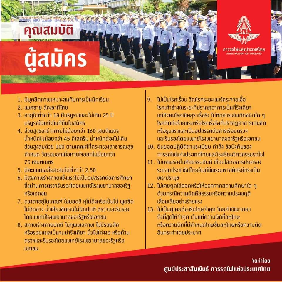 ทั้งนี้ ผู้สนใจเข้าสมัครสอบ ต้องเป็นเพศชาย สัญชาติไทย อายุไม่ต่ำกว่า 18 ปีบริบูรณ์ และไม่เกิน 25 ปีบริบูรณ์นับถึงวันที่ยื่นใบสมัคร และมีคุณสมบัติตรงตามเงื่อนไขอื่นๆ ที่กำหนด โดยขั้นตอนการสมัครสอบให้เข้าในเว็บไซต์ เลือกหัวข้อ “รับสมัคร นักเรียนวิศวกรรมรถไฟ รุ่นที่ 63” และเลือกสาขาวิชาที่ต้องการ เพื่อลงทะเบียน กรอกข้อมูลของผู้สมัครให้ถูกต้องครบถ้วน จากนั้นรอขั้นตอนการอนุมัติ ซึ่งผู้สมัครสามารถติดตามสถานะได้ในหัวข้อสถานะการสมัคร และเมื่อได้รับการอนุมัติแล้ว จึงชำระเงินค่าธรรมเนียมสมัครสอบ อัตรา 300 บาทต่อคน ผ่านทางโมบายแบงกิ้ง หรือ พร้อมเพย์ เพื่อรอการประกาศรายชื่อผู้มีสิทธิเข้าสอบและเลขประจำตัวสอบอีกครั้ง