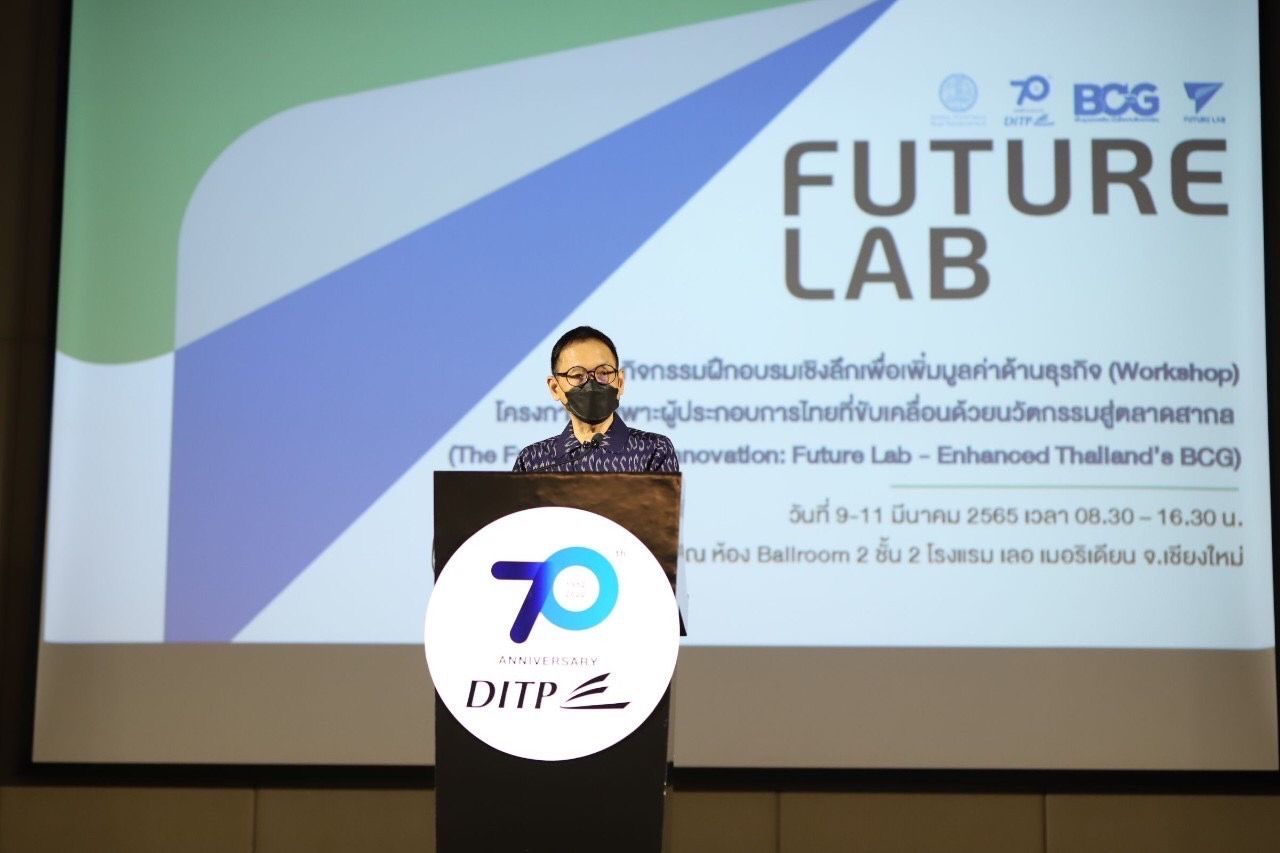 ภายใต้แนวคิด BCG Economy Model ซึ่งเป็นวาระแห่งชาติในการขับเคลื่อนพัฒนาเศรษฐกิจของประเทศ และสอดคล้องกับแผนงานหลักของกรมฯ และกระทรวงพาณิชย์”นายเอกฉัตรกล่าว น.ส.ประอรนุช ประนุช ผู้อำนวยการสำนักส่งเสริมนวัตกรรมและสร้างมูลค่าเพิ่มเพื่อการค้า กรมส่งเสริมการค้าระหว่างประเทศ (DITP) กล่าวว่า โครงการ Future.Lab เป็นโครงการบ่มเพาะผู้ประกอบการ