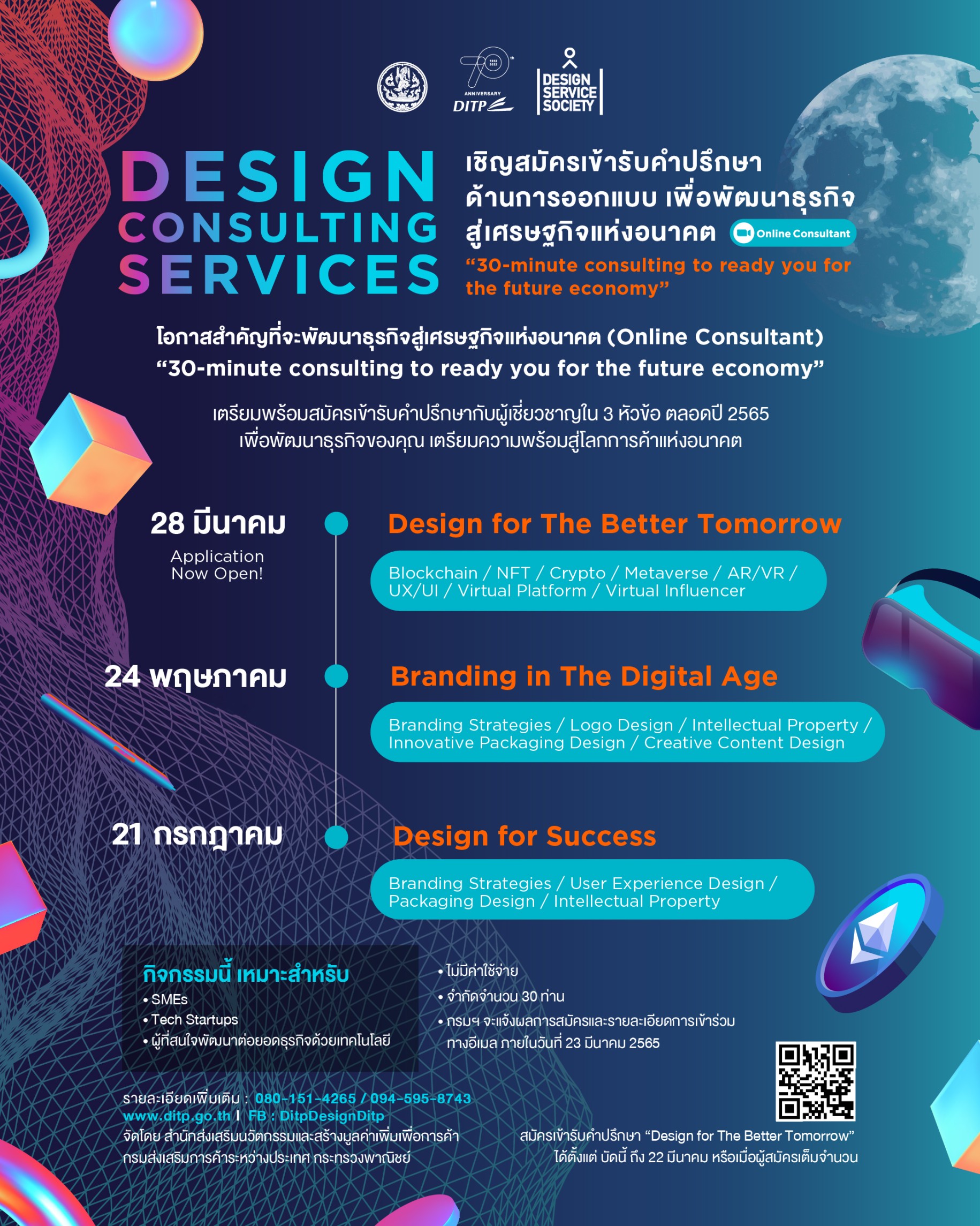 • กิจกรรมบริการให้คำปรึกษาด้านการออกแบบ (Design Consulting Service) รูปแบบออนไลน์ซึ่งเป็นเวทีให้ผู้ประกอบการได้มารับคำปรึกษาเพื่อพัฒนาธุรกิจกับผู้เชี่ยวชาญด้านการออกแบบและเทคโนโลยี เป็นจุดเริ่มต้นในการเป็นพันธมิตรทางการค้าต่อไปในอนาคต โดยแบ่ง การให้คำปรึกษาออกเป็น
