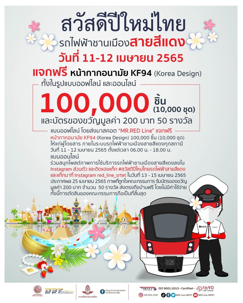 บริษัท รถไฟฟ้า ร.ฟ.ท. จำกัด หรือผู้ให้บริการรถไฟฟ้าชานเมืองสายสีแดง สวัสดีปีใหม่ไทยผู้โดยสารเนื่องในโอกาสเทศกาลสงกรานต์ จัดกิจกรรมการตลาดสุดพิเศษ เพื่อส่งมอบความสุข และความห่วงใยให้แก่ผู้โดยสาร ทั้งรูปแบบออฟไลน์ และออนไลน์ โดยส่งมาสคอต “MR.RED Line” ออกแจกหน้ากากอนามัย KF94 (Korea Design) จำนวน 100,000 ชิ้น (10,000 ชุด) ภายในระบบรถไฟฟ้าชานเมืองสายสีแดงทุกสถานี และแจกบัตรของขวัญมูลค่า 200 บาท 50 รางวัล ให้แก่ผู้โดยสารที่ร่วมสนุกโพสต์ภาพการใช้บริการรถไฟฟ้าชานเมืองสายสีแดงลงใน Instagram ส่วนตัว และติดแฮชแท็ก #สวัสดีปีใหม่ไทยรถไฟฟ้าสายสีแดง และแท็กมาที่ Instagram red_line_srtet