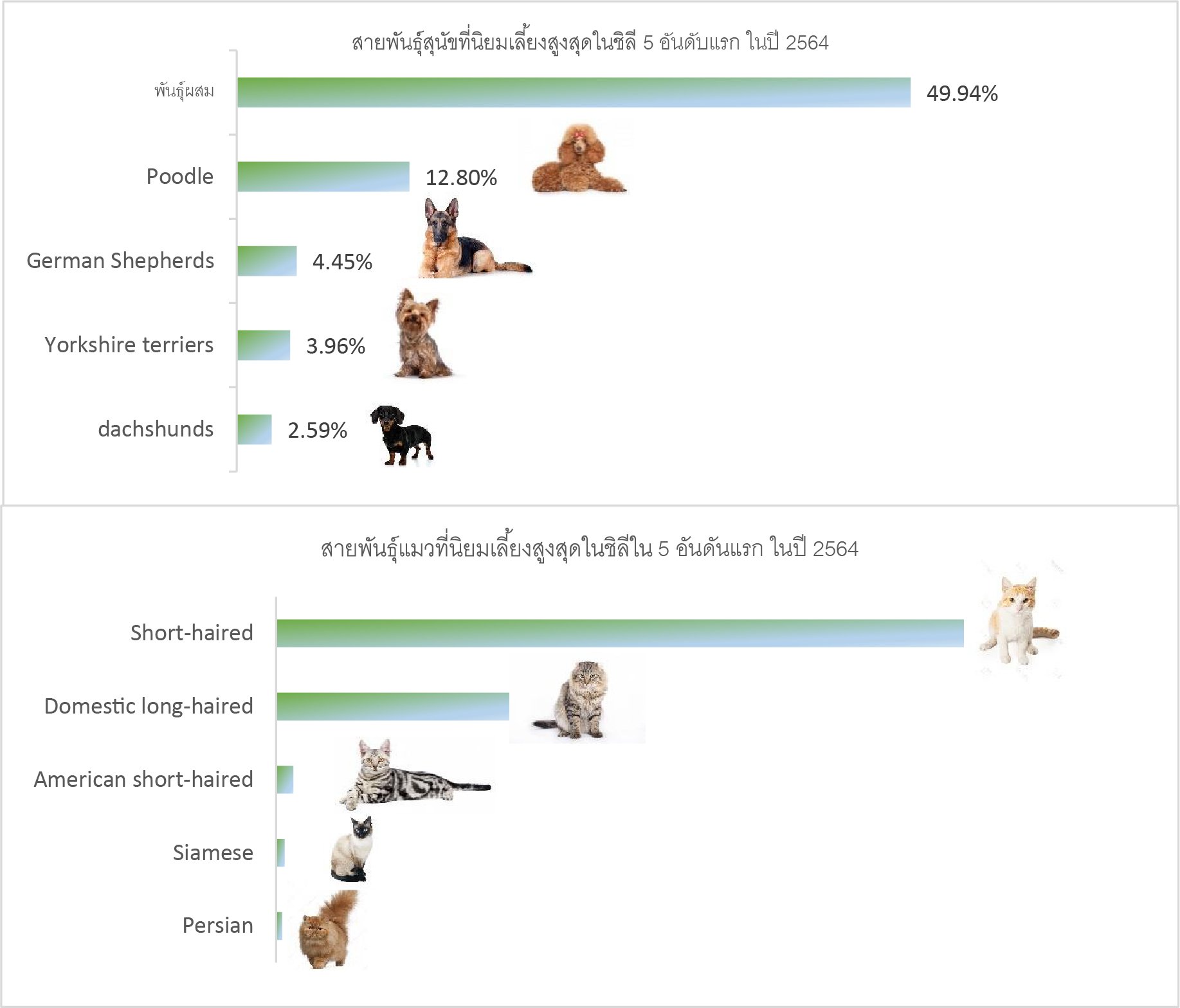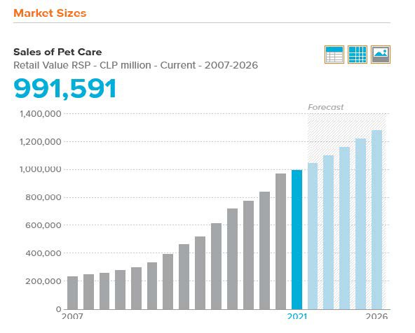 ทั้งนี้ จากการเก็บข้อมูลของบริษัทวิจัย Euromonitor ระบุว่า ยอดขายผลิตภัณฑ์สัตว์เลี้ยงในชิลีประจำปี 2564 มีมูลค่า 991,591 ล้านเปโซชิลี (ประมาณ 1,243 ล้านเหรียญสหรัฐ) เพิ่มขึ้น 2.6% และคาดว่าตลาดผลิตภัณฑ์สัตว์เลี้ยงจะยังคงมีแนวโน้มขยายตัวได้ดีต่อไปอีก ส่วนการรายงานจำนวนสัตว์เลี้ยงที่ได้รับการฝังไมโครชิพและขึ้นทะเบียนกับสำนักงานเขตในแต่ละท้องที่ มีจำนวนสูงถึง 1.53 ล้านตัว แบ่งออกเป็นสุนัขจำนวน 1.22 ล้านตัว และแมว 311,400 ตัว