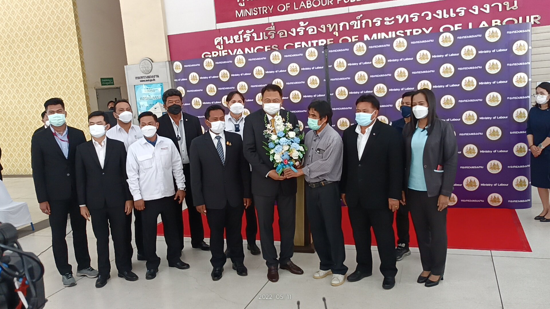 นายชาลี ลอยสูง ที่ปรึกษาคณะกรรมการสมานฉันท์แรงงานไทย นายชาญศิลป์ ทรัพย์โนนหวาย ประธานกลุ่มแรงงานเพื่อสังคม และคณะ ในโอกาสเข้าพบรัฐมนตรีว่าการกระทรวงแรงงาน เพื่อมอบช่อดอกไม้แสดงความขอบคุณรัฐบาล พล.อ.ประยุทธ์ จันทร์โอชา นายกรัฐมนตรีและรัฐมนตรีว่าการกระทรวงกลาโหม ผ่านรัฐมนตรีว่าการกระทรวงแรงงานที่ได้ดำเนินการช่วยผลักดันให้ร่างพระราชบัญญัติประกันสังคม (ฉบับที่ ..) พ.ศ. …. ได้ผ่านความเห็นชอบจากคณะรัฐมนตรี (ครม.) เมื่อวานนี้ (10 พ.ค.65) เนื่องจากก่อนหน้านี้กลุ่มผู้นำแรงงานได้เรียกร้องให้มีการแก้ไขเพิ่มเติมสิทธิประโยชน์กรณีชราภาพ เพื่อบรรเทาความเดือดร้อน โดยมี นางธิวัลรัตน์