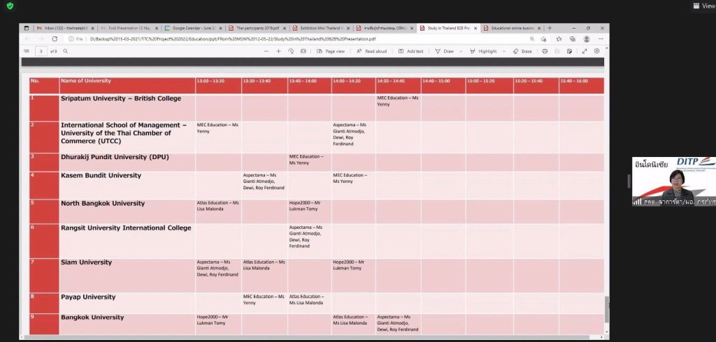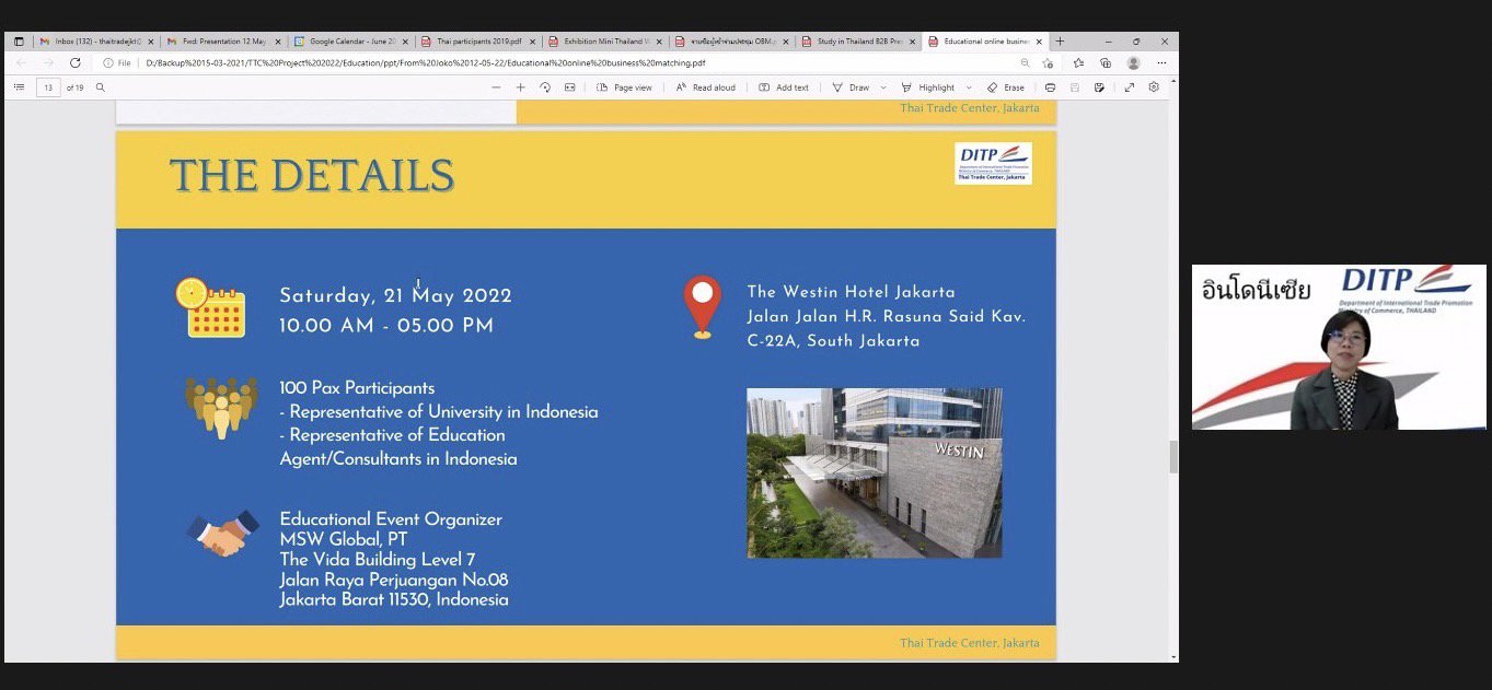 กรมส่งเสริมการค้าระหว่างประเทศ (DITP) เตรียมจัดเจรจาธุรกิจออนไลน์ (OBM) กลุ่มธุรกิจบริการการศึกษานานาชาติ ระหว่างสถาบันการศึกษาไทยกับสถาบันการศึกษาอินโดนีเซีย วันที่ 21 พ.ค.นี้ หวังดึงนักศึกษาอินโดนีเซียเข้ามาศึกษาในไทยเพิ่มขึ้น