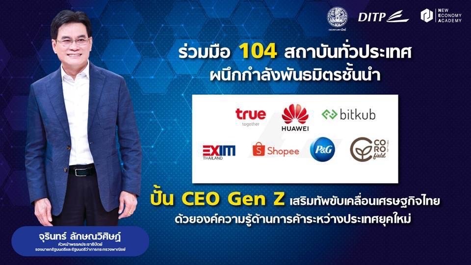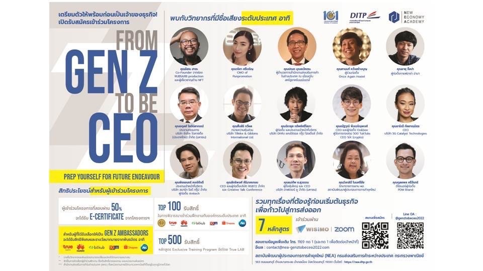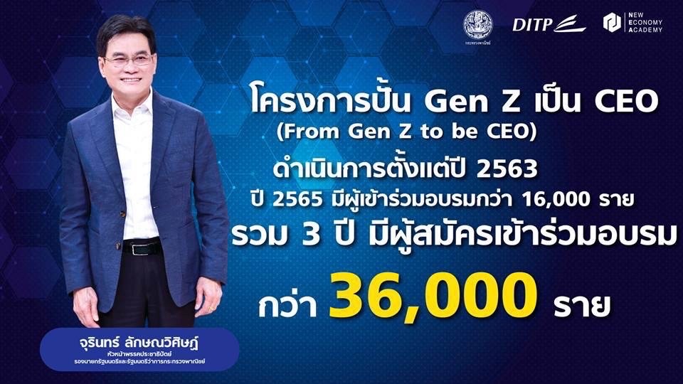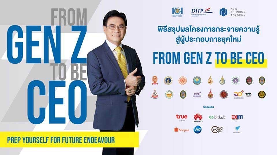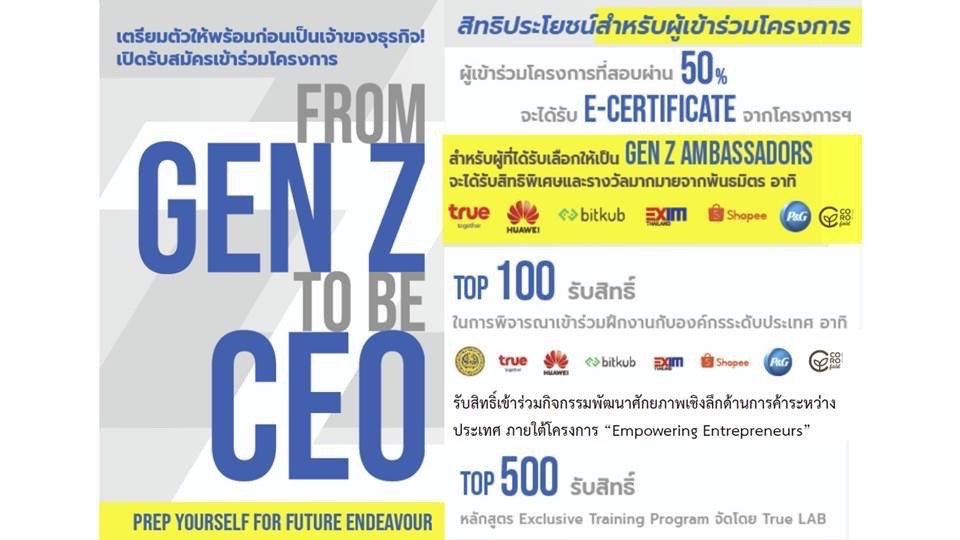 ข้อมูลจากกรมส่งเสริมการค้าระหว่างประเทศระบุว่า โครงการ From Gen Z to be CEO เป็นโครงการที่เกิดขึ้นภายใต้นโยบายของนายจุรินทร์ ลักษณวิศิษฏ์ เพื่อเพิ่มจำนวนผู้ประกอบการให้เกิดขึ้นในระบบเศรษฐกิจ โดยเฉพาะในกลุ่ม ผู้ประกอบการที่เป็นคนรุ่นใหม่ จัดอบรมหลักสูตรเตรียมความพร้อมสู่การเป็นผู้ประกอบการรุ่นใหม่ โดยมี CEOs และวิทยากรที่มีชื่อเสียงระดับประเทศร่วมถ่ายทอดความรู้และประสบการณ์ และร่วมมือกับ 104 สถาบันชั้นนำทั่วประเทศ และ