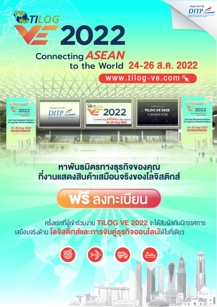 กรมส่งเสริมการค้าระหว่างประเทศ (DITP) กระทรวงพาณิชย์ เดินหน้าจัดงานแสดงสินค้าโลจิสติกส์เสมือนจริงและเจรจาธุรกิจออนไลน์ (TILOG Virtual Exhibition : TILOG VE 2022) ต่อเนื่องเป็นปีที่ 2 ภายใต้แนวคิด Connecting ASEAN to the World ตอกย้ำภาพลักษณ์งานโลจิสติกส์ครบวงจรของอาเซียน เพื่อสร้างโอกาสทางการค้าให้กับผู้ประกอบการในธุรกิจโลจิสติกส์ระหว่างประเทศของไทย และเปิดประตูสู่การเป็นโลจิสติกส์ในภูมิภาค บนแพลตฟอร์ม http://www.tilog-ve.com ระหว่างวันที่ 24 – 26 สิงหาคม 2565