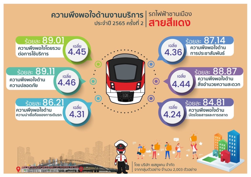 บริษัท รถไฟฟ้า ร.ฟ.ท. จำกัด หรือผู้ให้บริการรถไฟฟ้าชานเมืองสายสีแดงเผยผลสำรวจความพึงพอใจผู้โดยสารที่ใช้บริการรถไฟฟ้าชานเมืองสายสีแดง ประจำปี 2565 ครั้งที่ 2