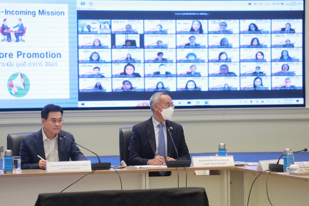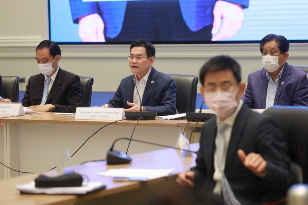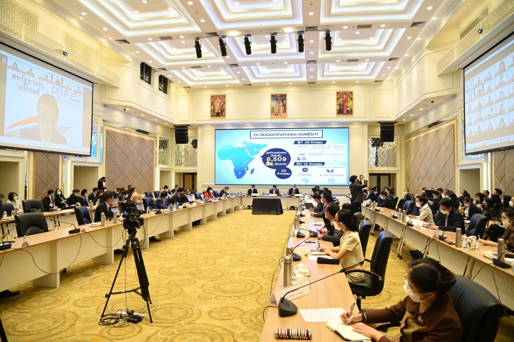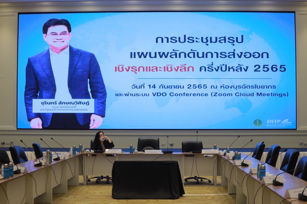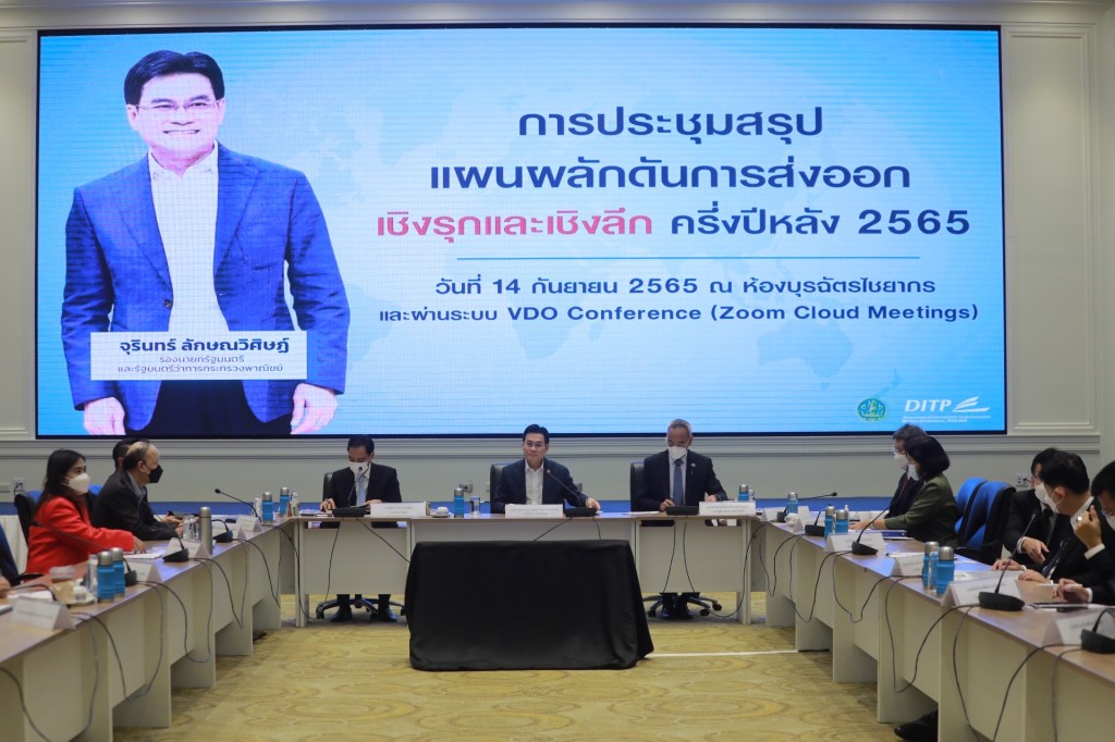 นายจุรินทร์ ลักษณวิศิษฏ์ หัวหน้าพรรคประชาธิปัตย์ รองนายกรัฐมนตรีและรัฐมนตรีว่าการกระทรวงพาณิชย์ แถลงภายหลังการประชุมสรุปแผนผลักดันการส่งออกเชิงรุกและเชิงลึก ครึ่งปีหลัง 2565 พร้อมด้วยนายกีรติ รัชโน รองปลัดกระทรวงพาณิชย์ นายภูสิต รัตนกุล เสรีเริงฤทธิ์ อธิบดีกรมส่งเสริมการค้าระหว่างประเทศและคณะผู้บริหารกระทรวงพาณิชย์และตัวแทนภาคเอกชน ที่ห้องบุรฉัตรไชยากร ชั้น 4 ตึกสำนักงานปลัด กระทรวงพาณิชย์ และผ่านระบบ VDO Conference กับสำนักงานส่งเสริมการค้าในต่างประเทศ (สคต.)