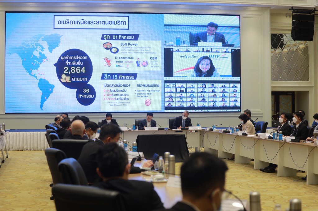 สำหรับการทำรายได้ให้ประเทศในเรื่องการส่งออกยังเป็นไปด้วยดีปี ที่แล้วสามารถทำเงินให้กับประเทศถึง 8.5 ล้านล้านบาท เป็นบวกถึง 17.1% และปี 65 ตั้งเป้าจะทำเงินให้กับประเทศถึง 9 ล้านล้านบาท เพิ่มขึ้นอย่างน้อย 4% แต่ในช่วง 7 เดือนแรกของปีนี้ ตั้งแต่ ม.ค.-ก.ค.ทำเงินให้ประเทศแล้ว 5.774 ล้านล้านบาท เพิ่มขึ้นเกินเป้าที่ 4% เป็น 11.5% ตนได้มอบให้กระทรวงพาณิชย์รวมทั้งกรมส่งเสริมการค้าระหว่างประเทศและภาคเอกชน รวมทั้งทูตพาณิชย์ของเราจากทั่วโลกปรับแผน เพื่อทำเงินให้ได้มากกว่านี้โดยเฉพาะในครึ่งปีหลัง ได้มอบนโยบายจัดทำแผนทั้งเชิงรุกและเชิงลึก เพื่อทำรายได้จากการส่งออกให้ได้มากที่สุด ซึ่งทูตพาณิชย์จากทุกประเทศ ได้จัดทำแผนร่วมกับกรมส่งเสริมการค้าระหว่างประเทศและภาคเอกชน ทำแผนงานที่มีความชัดเจน จากเดิมกำหนดไว้กิจกรรมในปี 2565 ไว้ที่ 185 กิจกรรม เดินหน้าให้ได้ตัวเลขส่งออก 9 ล้านล้านบาท แผนใหม่ปรับเป็น 530 กิจกรรม มีกิจกรรมใหม่เพิ่มขึ้นอีก 345 กิจกรรม เพื่อทำตัวเลขครึ่งปีหลังเพิ่มขึ้นกว่าเป้าเดิมที่ทำไว้ ซึ่ง 345 กิจกรรม ทั้งกิจกรรมเชิงรุกและเชิงลึก ไม่ว่าจะเป็น เร่งรัด Mini-FTA ส่งเสริมการค้าระบบออนไลน์ การจับคู่เจรจาธุรกิจ การนำซอฟพาวเวอร์ใส่สินค้าและบริการของไทย การให้ความสำคัญกับ BCG การเร่งรัดการเดินหน้าตามนโยบาย รักษาตลาดเดิม เพิ่มตลาดใหม่และฟื้นตลาดเก่า โดยมีมาตรการรายละเอียดเพิ่มเติมชัดเจน ในการเจาะตลาดใหม่มีรูปแบบชัดเจนคือ การเจาะตลาดเมืองรอง จากที่เน้นการเจาะเมืองหลักในช่วงที่ผ่านมา ซึ่งตลาดเมืองรองมีเป้าหมายชัดเจนจะเจาะทั้งหมดใน 36 ประเทศ 105 เมือง และเจาะตลาดสินค้าชนิดใหม่เพิ่มเติม เช่น ซาอุดีอาระเบียที่ตนนำคณะไปเจรจา จะเน้นสินค้าก่อสร้างและการให้บริการด้านการก่อสร้าง ซึ่งซาอุดีอาระเบีย มีนโยบายสร้างเมืองใหม่และตลาดเฟอร์นิเจอร์ ตลาดสินค้าฮาลาล