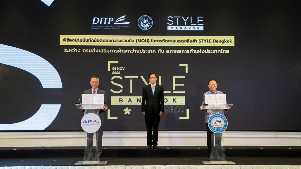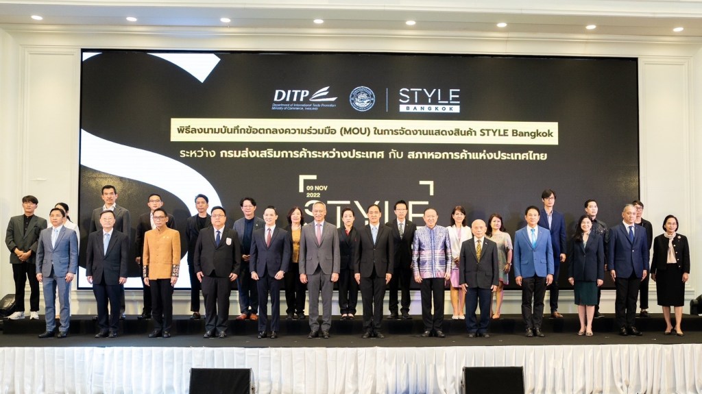 กรมส่งเสริมการค้าระหว่างประเทศ (DITP) ลงนาม MOU กับสภาหอการค้าแห่งประเทศไทย ร่วมมือจัดงาน STYLE Bangkok อย่างยิ่งใหญ่ หลังเตรียมจัดงานปกติเต็มรูปแบบ วันที่ 22-26 มีนาคม 2566 ตั้งเป้าเป็นเวทีที่เปิดโอกาสให้ผู้ส่งออก , SMEs , Micro SMEs และนักออกแบบ มีโอกาสพบปะเจรจาการค้ากับผู้ซื้อ ผู้นำเข้า เปิดตัวสินค้าไลฟ์สไตล์และแฟชั่นไทยออกสู่ตลาดต่างประเทศ