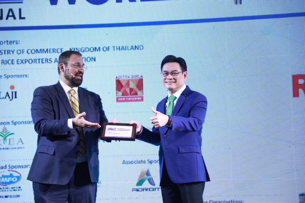 สำหรับประเทศไทย ปีนี้ถือเป็นประเทศผู้ผลิตและส่งออกข้าวรายสำคัญ โดยผลิตข้าวเป็นอันดับ 4 ของโลก ประเทศที่ผลิตมากที่สุดในโลกคือ จีน 147 ล้านตัน อินเดีย 124 ล้านตัน เวียดนาม 27 ล้านตันและไทยผลิตได้ 20 ล้านตัน สำหรับการส่งออก 9 เดือนแรกของปีนี้ ม.ค.-ก.ย.ประเทศไทยส่งออกข้าวแล้ว 2,796 ล้านเหรียญสหรัฐ เพิ่มขึ้น 35.5% ปีที่แล้วส่งออกได้ 6.1 ล้านตัน ปีนี้คาดว่าจะส่งออกได้ถึง 7.5 ล้านตันโดยประมาณ ด้านคุณภาพในฐานะรัฐมนตรีว่าการกระทรวงพาณิชย์ ในฐานะตัวแทนรัฐบาลไทย ขอยืนยันว่าข้าวไทยเป็นข้าวที่มีคุณภาพดีที่สุดในโลกชนิดหนึ่งหรือประเทศหนึ่ง ดูจากผลการประกวดข้าวโลกของนิตยสาร The Rice Trader ซึ่งจัดมา 13 ครั้งประเทศไทยได้แชมป์ข้าวโลกถึง 7 ครั้ง เกินกว่าครึ่งหนึ่งของการจัดประกวด คือเครื่องการันตีว่าข้าวไทยเป็นข้าวที่มีคุณภาพมากที่สุดในโลกประเทศหนึ่ง