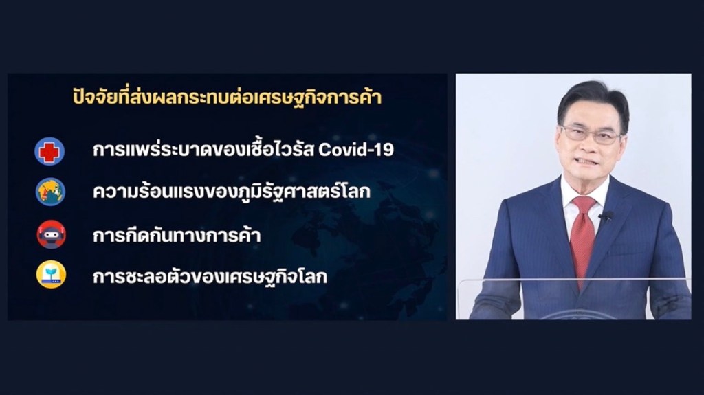 “ตนมีหลัก 2 ข้อคือ 1.อะไรที่เกินกำลังเราต้องเว้นไว้ก่อน เช่น สั่งให้ 2 ประเทศหยุดทำสงครามไม่ได้ ต้องเผชิญหน้ากับมันแต่อะไรที่เป็นปัจจัยที่เราควบคุมได้ ต้องเร่งทำโดยเฉพาะตัวเลขการส่งออก ตนมอบหมายให้กรมส่งเสริมการค้าระหว่างประเทศกับกระทรวงพาณิชย์ทุกหน่วยงาน เร่งหารือกับภาคเอกชนเพราะตนมั่นใจว่าการทำงานร่วมกันของทั้งสองฝ่ายอย่างใกล้ชิดคือพลังสำคัญ ช่วยให้เราฝ่าปัญหาและความท้าทายทั้งหมดที่จะเกิดขึ้นนี้ไปได้ ซึ่งได้มีการหารือร่วมกันระหว่างกระทรวงพาณิชย์ สำนักงานเศรษฐกิจการค้า รวมทั้งภาคเอกชนที่จะช่วยกันหาคำตอบท่ามกลางเศรษฐกิจโลกที่ชะลอตัวทำตัวเลขการส่งออกให้เติบโตต่อไปได้ได้อย่างไร มีอะไรบ้างที่ทำได้ในเวลาที่รวดเร็วมาช่วยกันทำ ตลาดไหนมีศักยภาพที่เราสามารถบุกได้ ตนพร้อมร่วมมือกับพวกเราทุกคนเปิดโอกาสให้เอสเอ็มอี ไมโครเอสเอ็มอี วิสาหกิจชุมชน มีโอกาสร่วมเปิดตลาดทำตัวเลขการส่งออกให้ประสบความสำเร็จต่อไปเป็นรูปธรรม เพื่อสร้างเงินให้กับประเทศของเราให้ประสบความสำเร็จต่อไปในอนาคต” รองนายกรัฐมนตรีและรัฐมนตรีว่าการกระทรวงพาณิชย์กล่าว