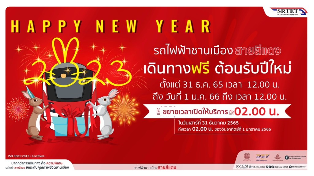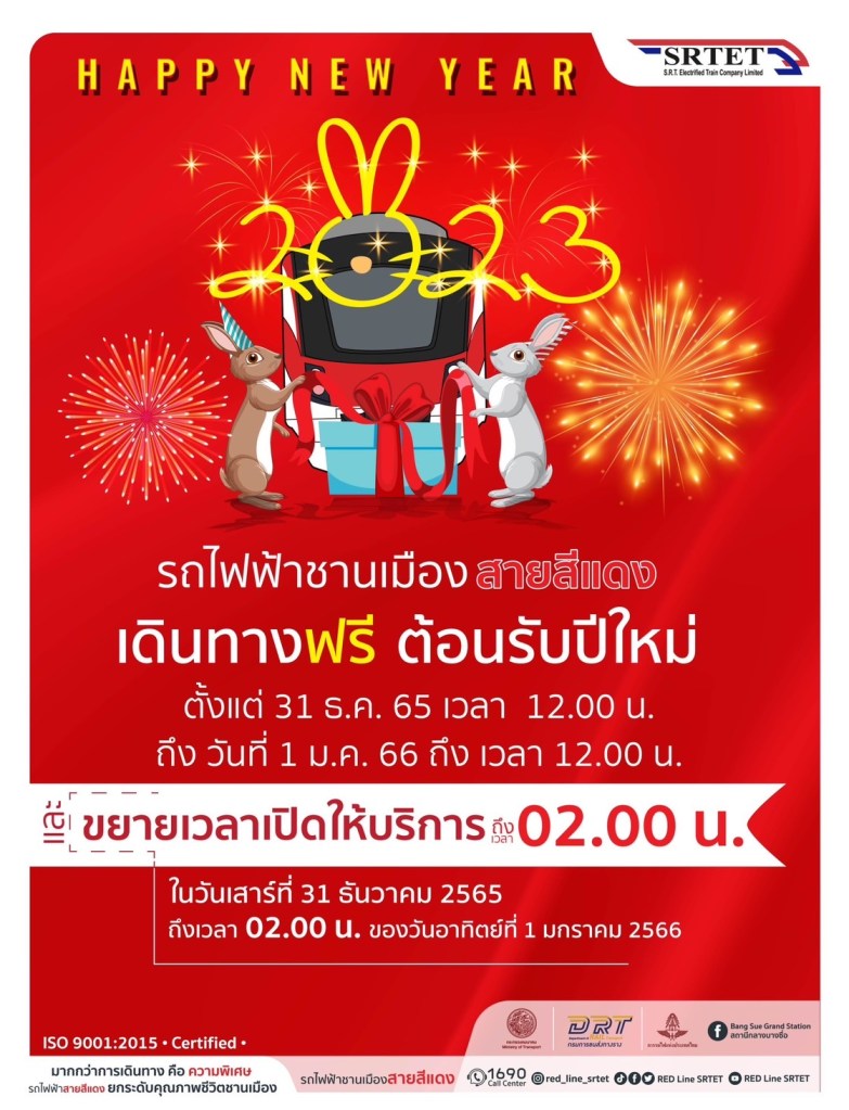 รถไฟฟ้าชานเมืองสายสีแดง ขอส่งมอบความสุขส่งท้ายปีเก่าต้อนรับปีใหม่ ผู้โดยสารเดินทางฟรี ระหว่างเวลา 12.00 น. ของวันที่ 31 ธ.ค. 65 ถึงเวลา 12.00 น. ของวันที่ 1 ม.ค. 66