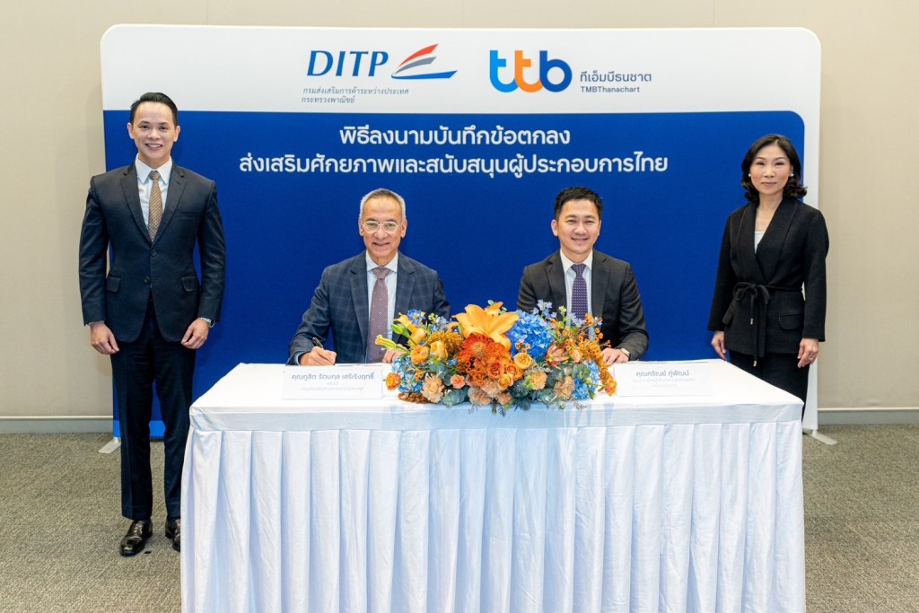 นายภูสิต รัตนกุล เสรีเริงฤทธิ์ อธิบดีกรมส่งเสริมการค้าระหว่างประเทศ กระทรวงพาณิชย์ เปิดเผยว่า เมื่อวันพุธที่ 8 กุมภาพันธ์ 2566 กรมส่งเสริมการค้าระหว่างประเทศ (DITP) และธนาคารทหารไทย ธนชาต หรือ ทีเอ็มบีธนชาต ได้ร่วมกันลงนามบันทึกข้อตกลง (MOU) “ความร่วมมือในการส่งเสริมศักยภาพและสนับสนุนผู้ประกอบการไทย” ณ กรมส่งเสริมการค้าระหว่างประเทศ ถนนรัชดาภิเษก โดยความตกลงดังกล่าวมีเนื้อหาครอบคลุมความร่วมมือระหว่างทั้งสององค์กรในหลากหลายด้าน เช่น การบูรณาการข้อมูลการสนับสนุนทางการเงินและสิทธิประโยชน์แก่ผู้ประกอบการ และการส่งเสริมองค์ความรู้ให้กับผู้ประกอบการ เป็นต้น