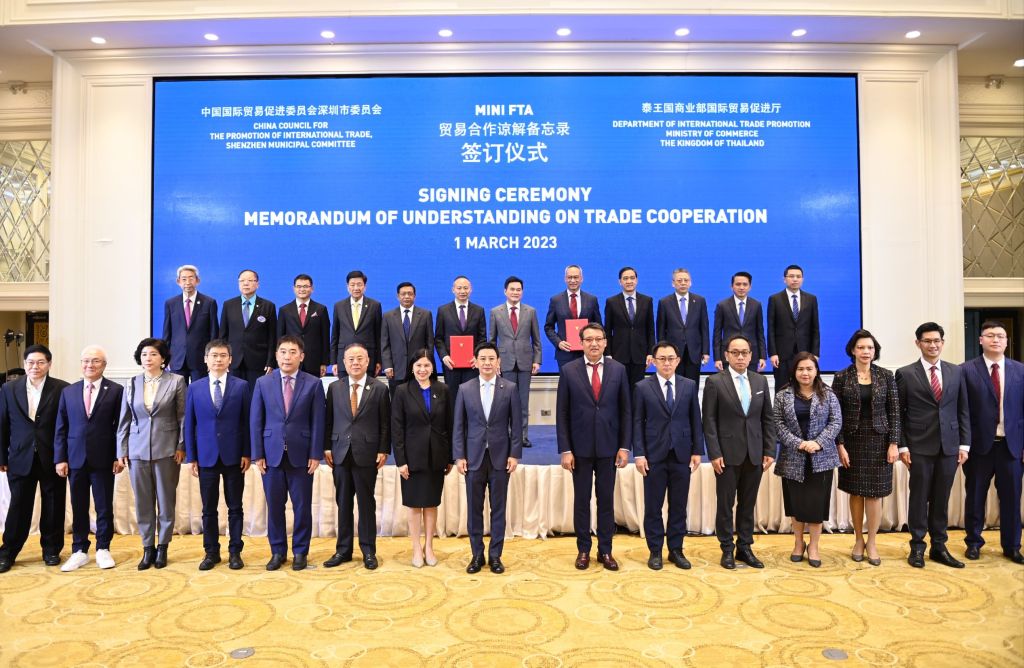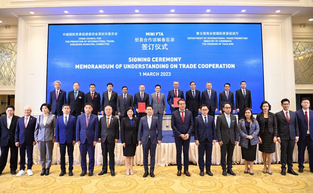 “ปี 2565 มูลค่าการค้าระหว่างไทยกับเซินเจิ้น มีมูลค่า 868,000 ล้านบาท ตั้งเป้าร่วมกันหลังมี mini FTA ภายใน 2 ปีที่ (2566-2567)จะทำให้มูลค่าการค้าระหว่างกันเพิ่มขึ้นอย่างน้อย 5% ตั้งเป้าเพิ่มอีก 43,000 ล้านบาท ในปี 66 และ 130,000 ล้านบาท ในปี 67 จะเป็นกลไกสำคัญเพิ่มมูลค่าการค้าการลงทุนอย่างเป็นรูปธรรม ผลักดันเศรษฐกิจของไทยและจีนให้เจริญก้าวหน้าสืบไป” รองนายกรัฐมนตรีและรัฐมนตรีว่าการกระทรวงพาณิชย์กล่าว