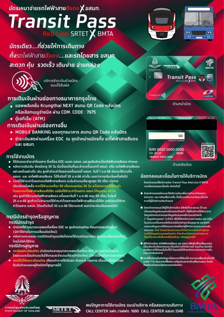 บัตรเดียวที่ช่วยให้การเดินทางทั้งรถไฟฟ้าสายสีแดงและรถโดยสาร ขสมก. “สะดวก คุ้ม รวดเร็ว เติมง่าย จ่ายคล่อง” Transit Pass RED Line SRTET X BMTA
