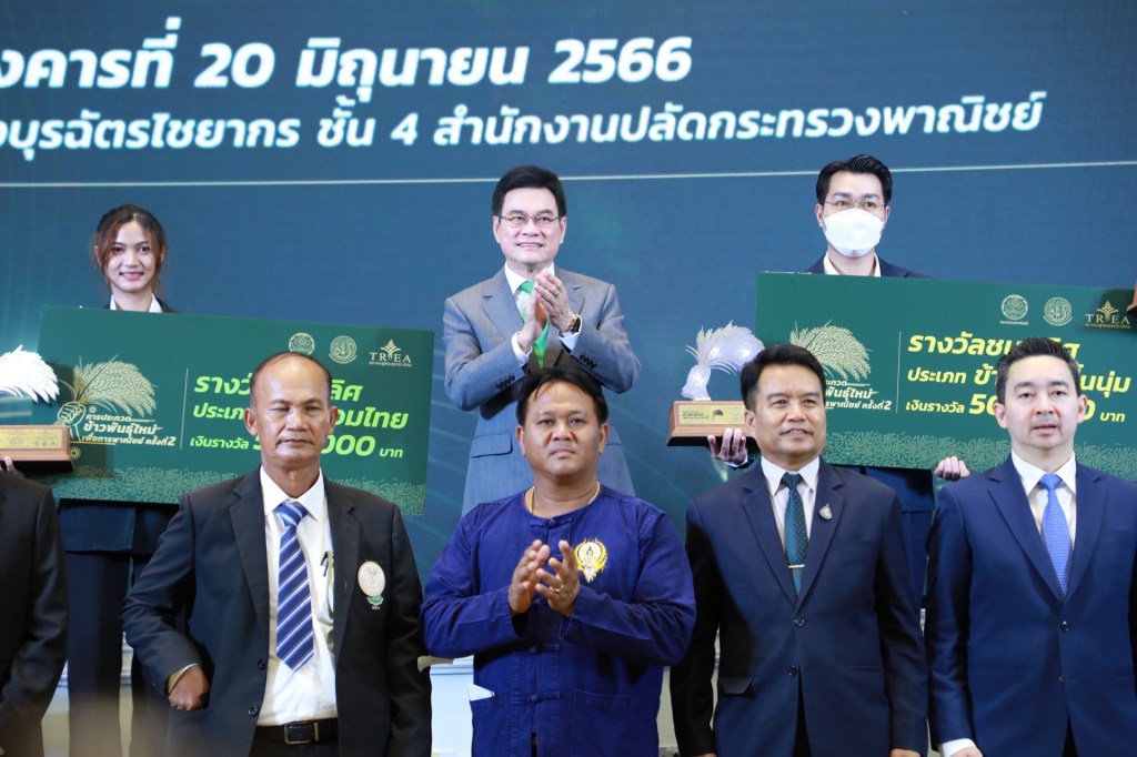วันที่ 20 มิถุนายน 2566 เวลา 14.30 น. ที่กระทรวงพาณิชย์ นายจุรินทร์ ลักษณวิศิษฏ์ รองนายกรัฐมนตรีและรัฐมนตรีว่าการกระทรวงพาณิชย์ พร้อมด้วย นายกีรติ รัชโน ปลัดกระทรวงพาณิชย์ นายรณรงค์ พูลพิพัฒน์ อธิบดีกรมการค้าต่างประเทศ ร.ต.ท. เจริญ เหล่าธรรมทัศน์ นายกสมาคมผู้ส่งออกข้าวไทย สมาคมการค้าเมล็ดพันธุ์ข้าวไทย นักวิจัย ผู้บริหารกระทรวงพาณิชย์และกระทรวงเกษตรและสหกรณ์ มอบรางวัลการประกวดข้าวพันธุ์ใหม่เพื่อการพาณิชย์ ครั้งที่ 2 พร้อมชูนโยบายตลาดนำการผลิต ผลักดันข้าวไทยพันธุ์ใหม่ออกไปแข่งขันในตลาดโลก