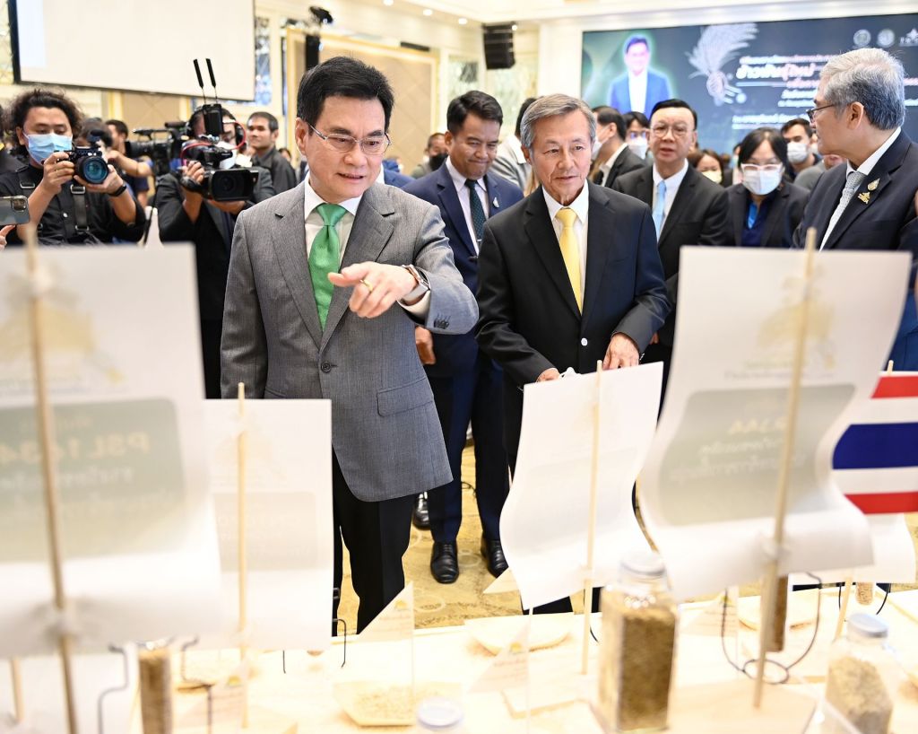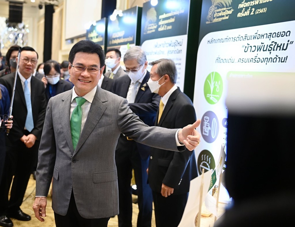ประเทศไทยมีจุดอ่อนคือขาดความหลากหลายของผลิตภัณฑ์ที่เสนอขายในตลาดข้าวโลก เป็นจุดอ่อนสำคัญ โดยเร่งเพิ่มพันธุ์ข้าวชนิดใหม่ เพื่อแข่งขันตลาดข้าวโลกกับประเทศคู่แข่ง ตั้งเป้า 5 ปี เพิ่มพันธุ์ข้าวใหม่อย่างน้อย 12 พันธุ์ เป็นข้าวพื้นแข็ง 4 พันธุ์ ข้าวพื้นนุ่ม 4 พันธุ์ ข้าวหอม 2 พันธุ์ และข้าว โภชนาการสูง 2 พันธุ์ ภายใต้ความร่วมมือของภาครัฐและเอกชน ทุกภาคส่วน ทำให้เราปรับปรุงพันธุ์ข้าวได้ข้าวพันธุ์ใหม่เกินเป้าหมาย ช่วงปี 63-65 กรมการข้าวปรับปรุงข้าวพันธุ์ใหม่และรับรองพันธุ์สำเร็จแล้ว 12 พันธุ์ และสมาคมผู้ส่งออกข้าวไทย จัดประกวดพันธุ์ข้าวชนิดใหม่ ทำมา 2 ปี ครั้งแรก ปี 64 ได้ข้าวพันธุ์ใหม่ 6 สายพันธุ์ มีการรับรองพันธุ์ทดลองปลูกในแปลง ปีนี้เป็นปีที่ 2 ได้ข้าวพันธุ์ใหม่เพิ่มมาอีก 3 พันธุ์ ภายใน 3 ปี 63-65 วันนี้ทะลุเป้าแล้ว รวมกับของกรมการข้าว อีก 12 พันธุ์ รวมทำข้าวพันธุ์ใหม่ได้แล้ว 21 พันธุ์ ทะลุเป้าทั้งเชิงปริมาณจำนวนพันธุ์ข้าวและเงื่อนเวลาเร็วกว่าเป้าปี 67 ขอบคุณทุกคนที่มีส่วนสำคัญจากนี้จะฝากกรมการข้าวและกรมการค้าต่างประเทศกระทรวงพาณิชย์ ช่วยกันสนับสนุนให้เกิดขึ้นต่อไป และขอให้กรมการข้าวเร่งรัดการจดทะเบียนข้าวพันธุ์ใหม่จากการตัดสินการประกวดวันนี้โดยเร็ว เร่งผลิตเมล็ดพันธุ์ ทดลองปลูกในแปลงเกษตรกร นำผลผลิตไปเปิดตลาดข้าวโลกต่อไป ตนหวังว่าการส่งออกข้าวไทยจากนี้จะดีขึ้น ไทยจะมีผลิตภัณฑ์จากข้าวที่มีความหลากหลายขายตลาดโลกมากขึ้น