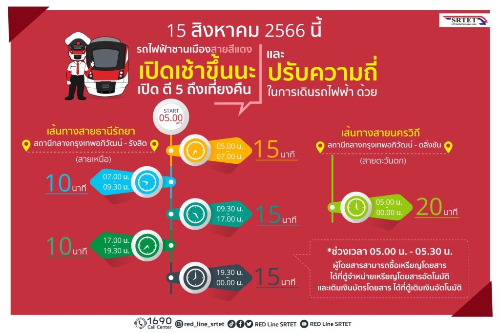 นายสุเทพ พันธุ์เพ็ง กรรมการผู้อำนวยการใหญ่บริษัท รถไฟฟ้า ร.ฟ.ท. จำกัด (รฟฟท.) หรือผู้ให้บริการรถไฟฟ้าชานเมืองสายสีแดง เปิดเผยว่า ตั้งแต่วันที่ 15 สิงหาคม 2566 เป็นต้นไป บริษัทฯจะปรับเวลาเปิดให้บริการเร็วขึ้น จากเดิมเปิดให้บริการในเวลา 05.30 น. เปลี่ยนเป็นเปิดให้บริการในเวลา 05.00 น. เพื่ออำนวยความสะดวกให้แก่ผู้ใช้บริการที่เพิ่มมากขึ้น และสามารถรองรับผู้ที่เดินทางโดยสายการบินต่างๆที่จะเดินทางมาถึงสนามบินดอนเมืองในช่วงเช้ามืด รวมถึงจะปรับเพิ่มความถี่ในการให้บริการเดินรถให้เร็วขึ้น ทั้งสายเหนือ (ธานีรัถยา) ช่วงสถานีกลางกรุงเทพอภิวัฒน์ – รังสิต ในช่วงชั่วโมงเร่งด่วน (Peak) เวลา 07.00 – 09.30 น และเวลา 17.00 – 19.30 น. จะปรับเพิ่มความถี่จากเดิม 12 นาทีต่อขบวน เป็น 10 นาทีต่อขบวน ในช่วงนอกชั่วโมงเร่งด่วน (Off Peak) จะปรับเพิ่มความถี่จากเดิม 20 นาทีต่อขบวน เป็น 15 นาทีต่อขบวน และสายตะวันตก (นครวิถี) ช่วงสถานีกลางกรุงเทพอภิวัฒน์ – ตลิ่งชัน ในช่วงชั่วโมงเร่งด่วน (Peak) ให้บริการความถี่เท่าเดิมที่ 20 นาทีต่อขบวน แต่จะปรับเพิ่มความถี่ในช่วง นอกชั่วโมงเร่งด่วน (Off Peak) จากเดิม 30 นาทีต่อขบวน เป็น 20 นาทีต่อขบวน เพื่อลดเวลาในการรอคอยขบวนรถไฟฟ้า รวมถึงช่วยดึงดูดผู้โดยสารให้มาใช้บริการเพิ่มขึ้นอีกด้วย