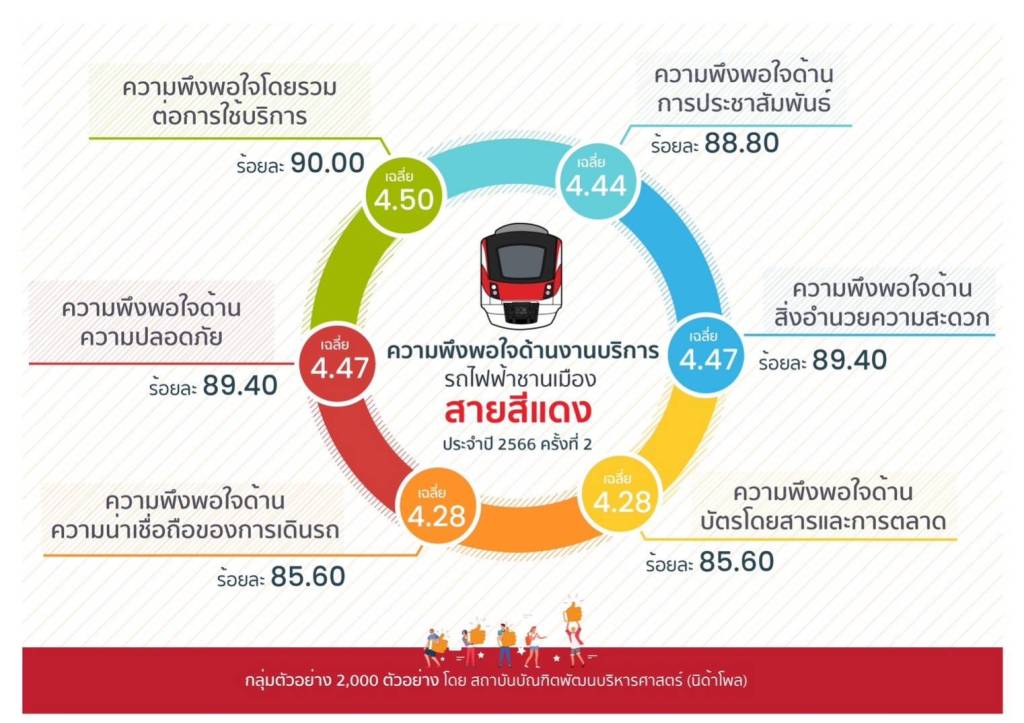 ซึ่งปัจจุบันมีผู้โดยสารมาใช้บริการรถไฟฟ้าสายสีแดงรวมมากกว่า 8 ล้านคน เฉลี่ยอยู่ที่วันละ 2.3 – 2.4 หมื่นคน หากเป็นวันศุกร์ผู้โดยสารจะอยู่ที่ประมาณ 2.5 หมื่นคน อีกทั้งบริษัทฯได้ดำเนินการสำรวจความพึงพอใจจากผู้ใช้บริการ ครั้งที่ 2 ประจำปี 2566 ลงพื้นที่สำรวจโดยสถาบันบัณฑิตพัฒนบริหารศาสตร์(นิด้า) ซึ่งเป็นสถาบันที่มีความเชี่ยวชาญในด้านการสำรวจและวิจัย โดยผลปรากฏว่าจากคะแนนเต็ม 5 ผู้โดยสารมีความพึงพอใจด้านการให้บริการ 4.50, ด้านความปลอดภัย 4.47, ด้านความน่าเชื่อถือต่อความตรงต่อเวลา ความถี่ และคุณภาพในการเดินรถไฟฟ้า 4.28, ด้านการประชาสัมพันธ์และให้ข้อมูล 4.44, ด้านคุณภาพและสิ่งอำนวยความสะดวกบนสถานี และในขบวนรถ 4.47, ด้านเหรียญโดยสาร/บัตรโดยสาร และกิจกรรมส่งเสริมการตลาด 4.28 ซึ่งจากผลสำรวจดังกล่าว แสดงให้เห็นว่าผู้โดยสารมีความเชื่อมั่นต่อการให้บริการรถไฟฟ้าชานเมืองสายสีแดงในด้านต่างๆเป็นอย่างมาก