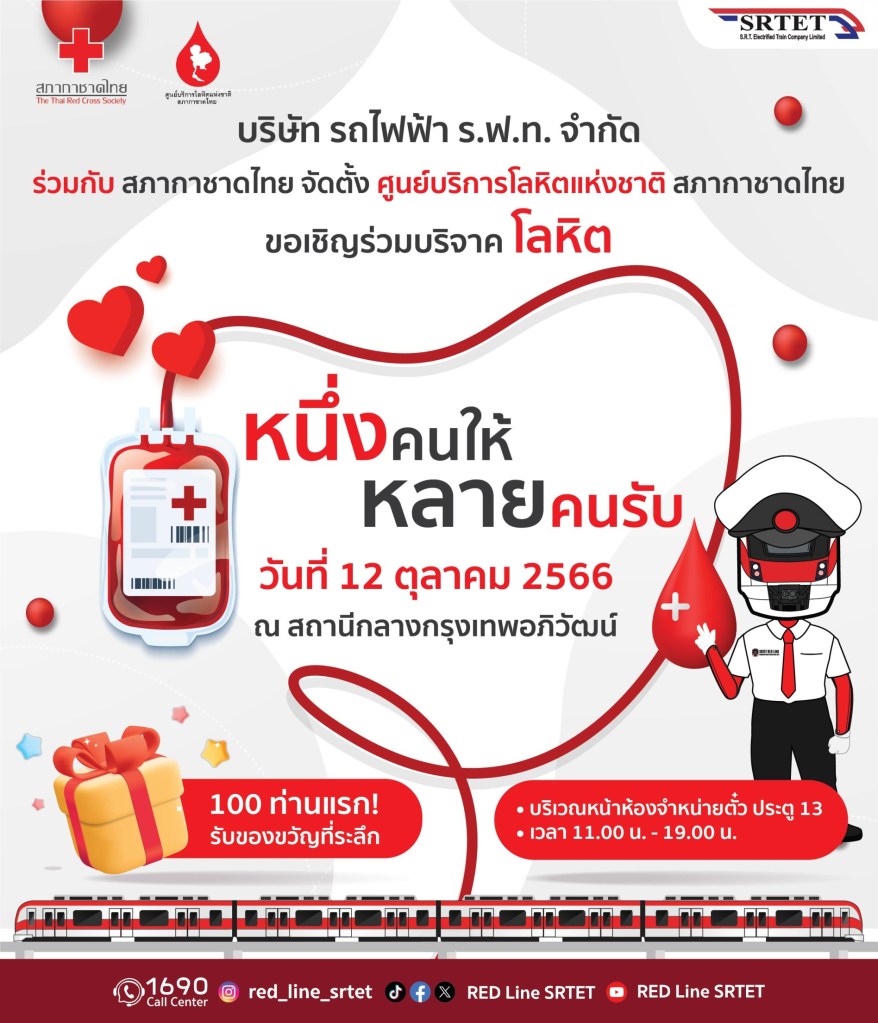 บริษัท รถไฟฟ้า ร.ฟ.ท. จำกัด ร่วมกับ สภากาชาดไทย ชวนบริจาคโลหิต ในโครงการ “หนึ่งคนให้ หลายคนรับ” ณ สถานีกลางกรุงเทพอภิวัฒน์ 12 ต.ค. 66 นี้