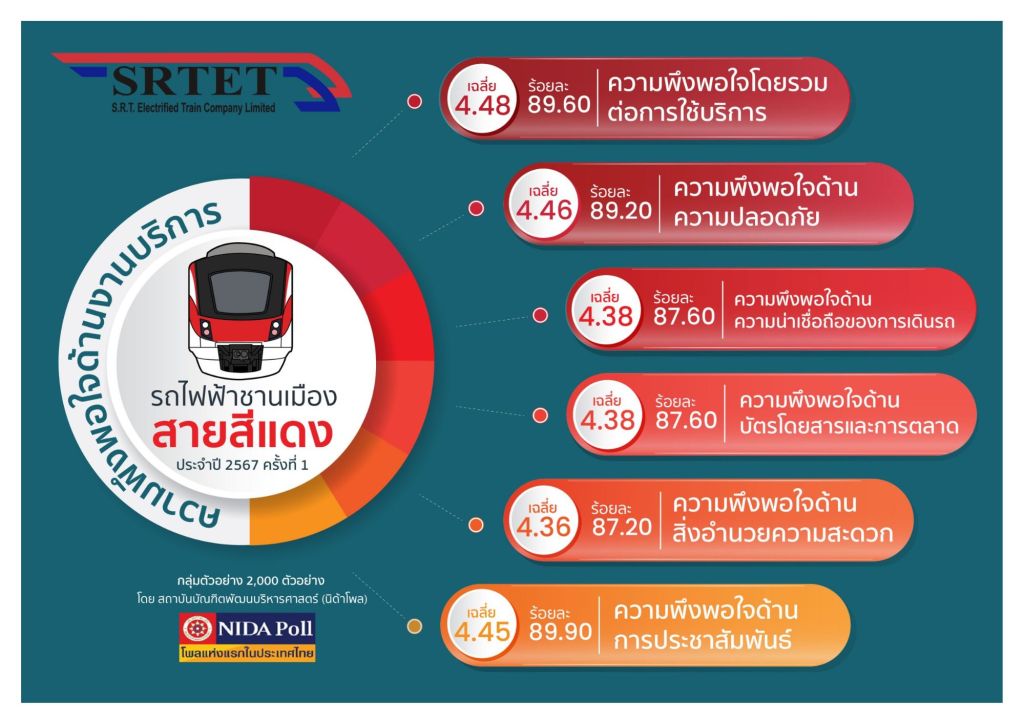 นายสุเทพ พันธุ์เพ็ง กรรมการผู้อำนวยการใหญ่ บริษัท รถไฟฟ้า ร.ฟ.ท. จำกัด (รฟฟท.) หรือผู้ให้บริการรถไฟฟ้าชานเมืองสายสีแดง เปิดเผยว่า บริษัทฯ ได้สำรวจความพึงพอใจผู้โดยสารในการใช้บริการรถไฟฟ้าชานเมืองสายสีแดง ประจำปี 2567 ครั้งที่ 1 เพื่อให้สามารถรวบรวมข้อมูล และเข้าถึงความต้องการของผู้โดยสาร สำหรับนำข้อมูลมาประยุกต์ใช้ในการยกระดับการให้บริการได้อย่างมีประสิทธิภาพ โดยได้สถาบันบัณฑิตพัฒนบริหารศาสตร์(นิด้าโพล) ซึ่งเป็นสถาบันที่มีความเชี่ยวชาญในด้านการสำรวจและวิจัย เป็นผู้ออกแบบ และลงพื้นที่สำรวจความพึงพอใจจากผู้ใช้บริการทั้ง 13 สถานี
