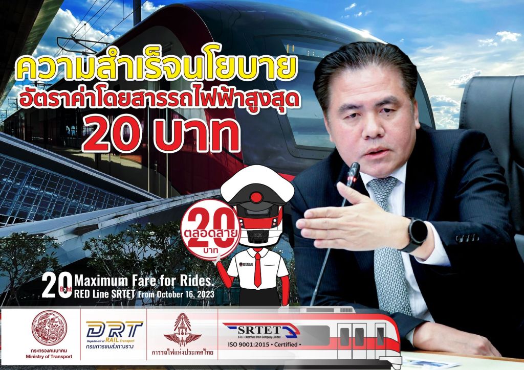 นายสุเทพ พันธุ์เพ็ง กรรมการผู้อำนวยการใหญ่ บริษัท รถไฟฟ้า ร.ฟ.ท. จำกัด หรือผู้ให้บริการรถไฟฟ้าชานเมืองสาย สีแดง เปิดเผยว่า ตามที่นายสุรพงษ์ ปิยะโชติ รัฐมนตรีช่วยว่าการกระทรวงคมนาคม ได้มอบนโยบายให้แก่บริษัท รถไฟฟ้า ร.ฟ.ท. จำกัด ดำเนินภารกิจโดยมุ่งเน้นการอำนวยความสะดวกในด้านการเดินทางอย่างไร้รอยต่อ และสร้างความพึงพอใจสูงสุดให้แก่ประชาชน โดยเฉพาะนโยบายอัตราค่าโดยสารรถไฟฟ้าสูงสุด 20 บาท ซึ่งถือเป็นหนึ่งในโครงการ Quick Win ที่สำคัญของกระทรวงคมนาคม โดยรถไฟฟ้าชานเมืองสายสีแดง ได้ขานรับและเริ่มดำเนินนโยบายดังกล่าว ตั้งแต่วันที่ 16 ตุลาคม 2566 โดยในระยะแรก เป็นการเก็บค่าโดยสารแบบแยกแต่ละสาย ในระบบรถไฟฟ้าชานเมืองสายสีแดง ทั้ง 2 เส้นทาง ได้แก่ สายธานีรัถยา ช่วงสถานีกลางกรุงเทพอภิวัฒน์ – สถานีรังสิต และสายนครวิถี ช่วงสถานีกลางกรุงเทพอภิวัฒน์ – สถานีตลิ่งชัน ต่อมาเมื่อวันที่ 30 พฤศจิกายน 2566 ได้เริ่มให้บริการในระยะที่ 2 ซึ่งผู้โดยสารสามารถเดินทางข้ามสายระหว่างรถไฟฟ้าชานเมืองสายสีแดง และรถไฟฟ้า MRT สายสีม่วง ช่วงคลองบางไผ่ – เตาปูน ได้ในอัตราค่าโดยสารรวมกันสูงสุดเพียง 20 บาท โดยรถไฟฟ้าทั้งสองสายนั้น มีสถานีเชื่อมต่อการเปลี่ยนถ่ายระบบอยู่ที่สถานีบางซ่อน โดยก่อนเริ่มนโยบายอัตราค่าโดยสารสูงสุด 20 บาท รถไฟฟ้าชานเมืองสายสีแดง มีปริมาณผู้ใช้บริการเฉลี่ยในวันธรรมดา(จันทร์ – ศุกร์) อยู่ที่ 21,813 คน/วัน แต่หลังจากเริ่มนโยบายอัตราค่าโดยสารสูงสุด 20 บาท มีจำนวนผู้ใช้บริการเพิ่มขึ้นอยู่ที่ 30,952 คน/วัน เพิ่มขึ้น 41.90% และสามารถทำสถิติผู้ใช้บริการสูงสุด (New High) อยู่ที่ 39,567 คน เมื่อวันที่ 9 กุมภาพันธ์ 2567 หรือหากนับจำนวนผู้โดยสารรวมตั้งแต่เริ่มนโยบายอัตราค่าโดยสารสูงสุด 20 บาท จนถึงปัจจุบัน เป็นระยะเวลากว่า 8 เดือน มีจำนวนผู้โดยสารรวมสูงถึง 7,078,082 คน โดยก่อนเริ่มนโยบายดังกล่าวมีการประเมินว่าอาจส่งผลให้บริษัทฯมีรายได้ลดลง แต่เนื่องจากมีปริมาณผู้ใช้บริการเพิ่มสูงขึ้นอย่างต่อเนื่อง จึงคาดการณ์ว่าเมื่อดำเนินการตามนโยบายฯครบ 1 ปี จะไม่ส่งผลกระทบต่อผลประกอบการของบริษัทฯ หากเปรียบเทียบกับช่วงก่อนเริ่มนโยบายฯ ทั้งนี้ สะท้อนให้เห็นว่า นโยบายอัตราค่าโดยสารรถไฟฟ้าสูงสุด 20 บาท ของกระทรวงคมนาคม ประสบผลสำเร็จเป็นอย่างมาก สามารถบรรลุเป้าหมายตามวัตถุประสงค์ที่จะช่วยแบ่งเบาภาระค่าครองชีพให้แก่ประชาชนได้