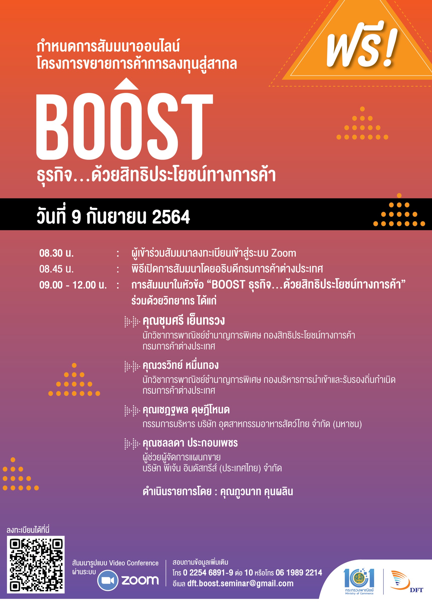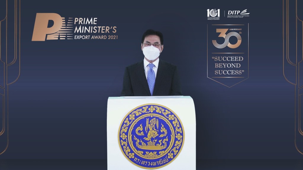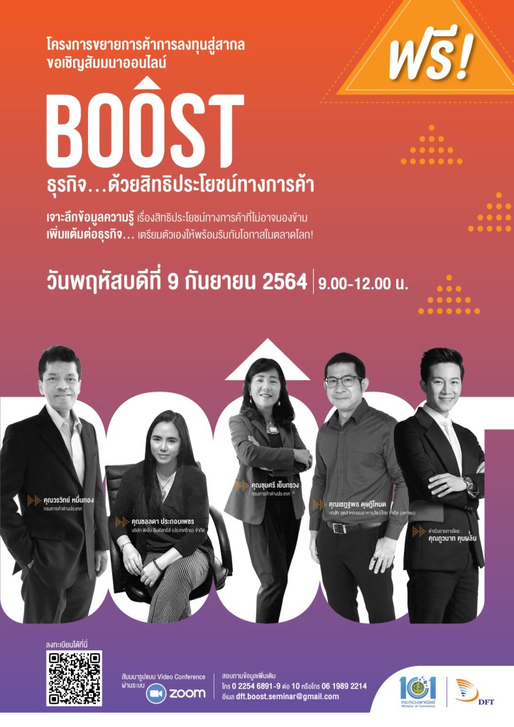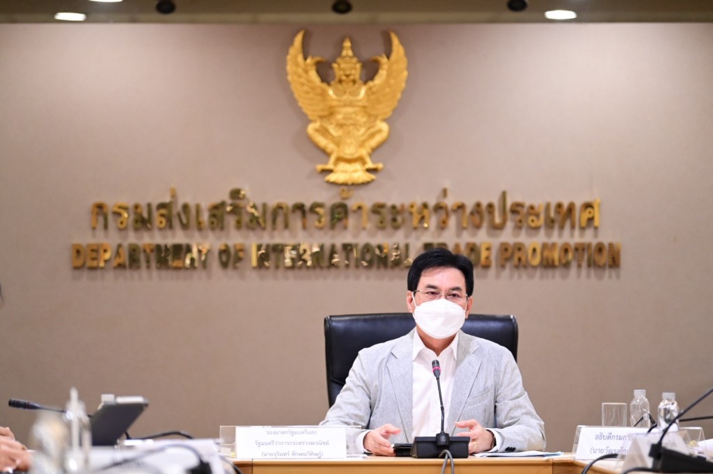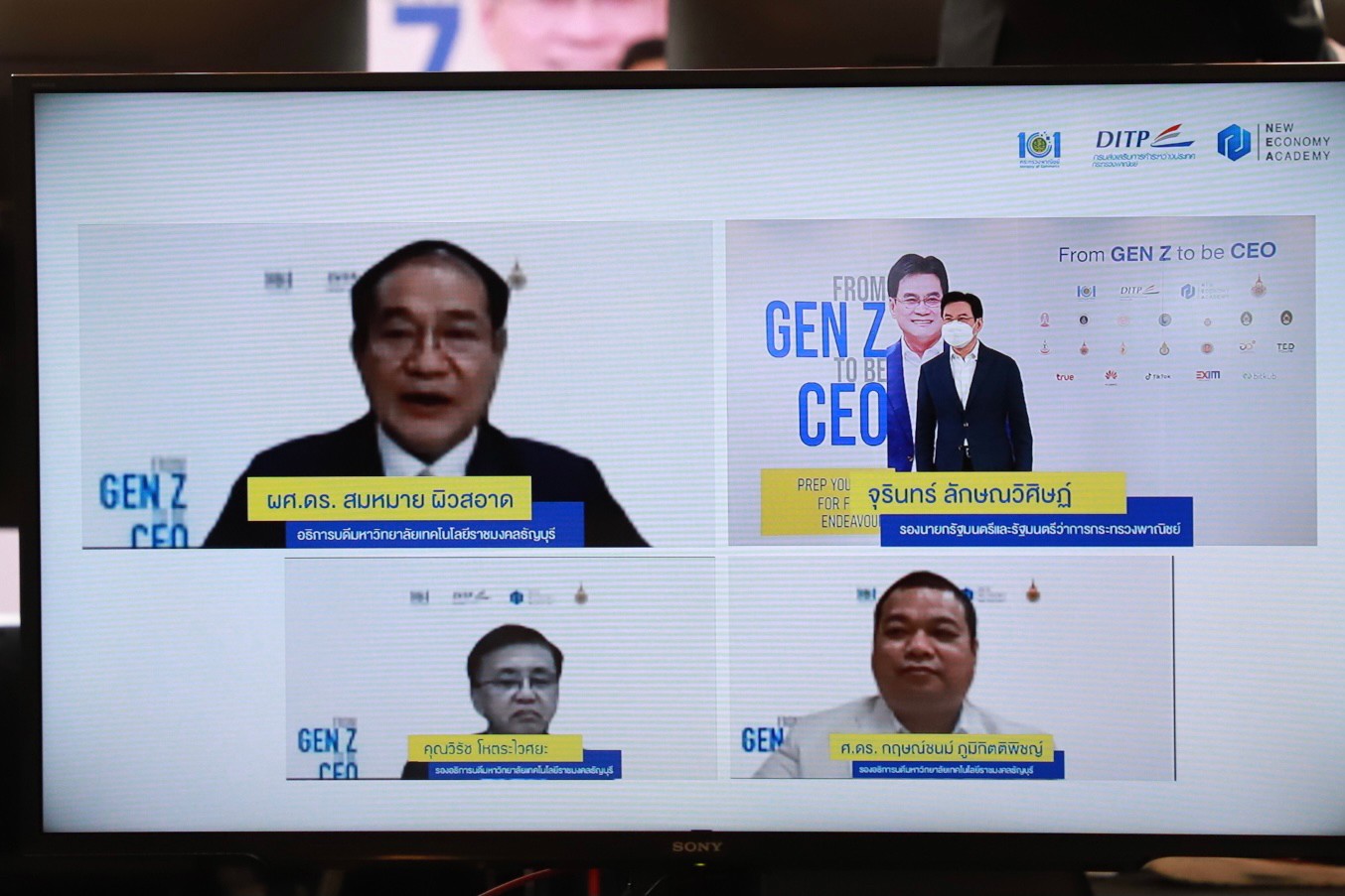 นายจุรินทร์ ลักษณวิศิษฏ์ หัวหน้าพรรคประชาธิปัตย์ รองนายกรัฐมนตรี และรัฐมนตรีว่าการกระทรวงพาณิชย์ นางมัลลิกา บุญมีตระกูล มหาสุข ที่ปรึกษารัฐมนตรีว่าการกระทรวงพาณิชย์ นายพิทักษ์ อุดมวิชัยวัฒน์ รองปลัดกระทรวงพาณิชย์ นายสมเด็จ สุสมบูรณ์ อธิบดีกรมส่งเสริมการค้าระหว่างประเทศ และ นายภูษิต รัตนกุล เสรีเริงฤทธิ์ ผู้อำนวยการสำนักงานนโยบายและยุทธศาสตร์การค้า ร่วมโครงการกระจายความรู้สู่ผู้ประกอบการยุคใหม่ (From Gen Z to be CEO) ผ่านระบบ Zoom ณ ห้องประชุมชั้น 11 กรมส่งเสริมการค้า ระหว่างประเทศ โดยมีผู้เข้าร่วม 1,500 คน