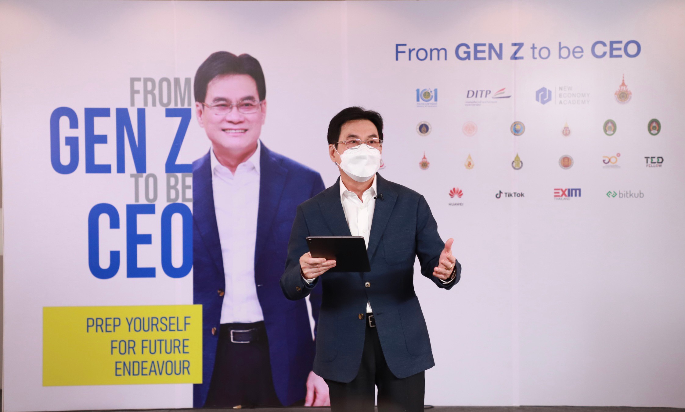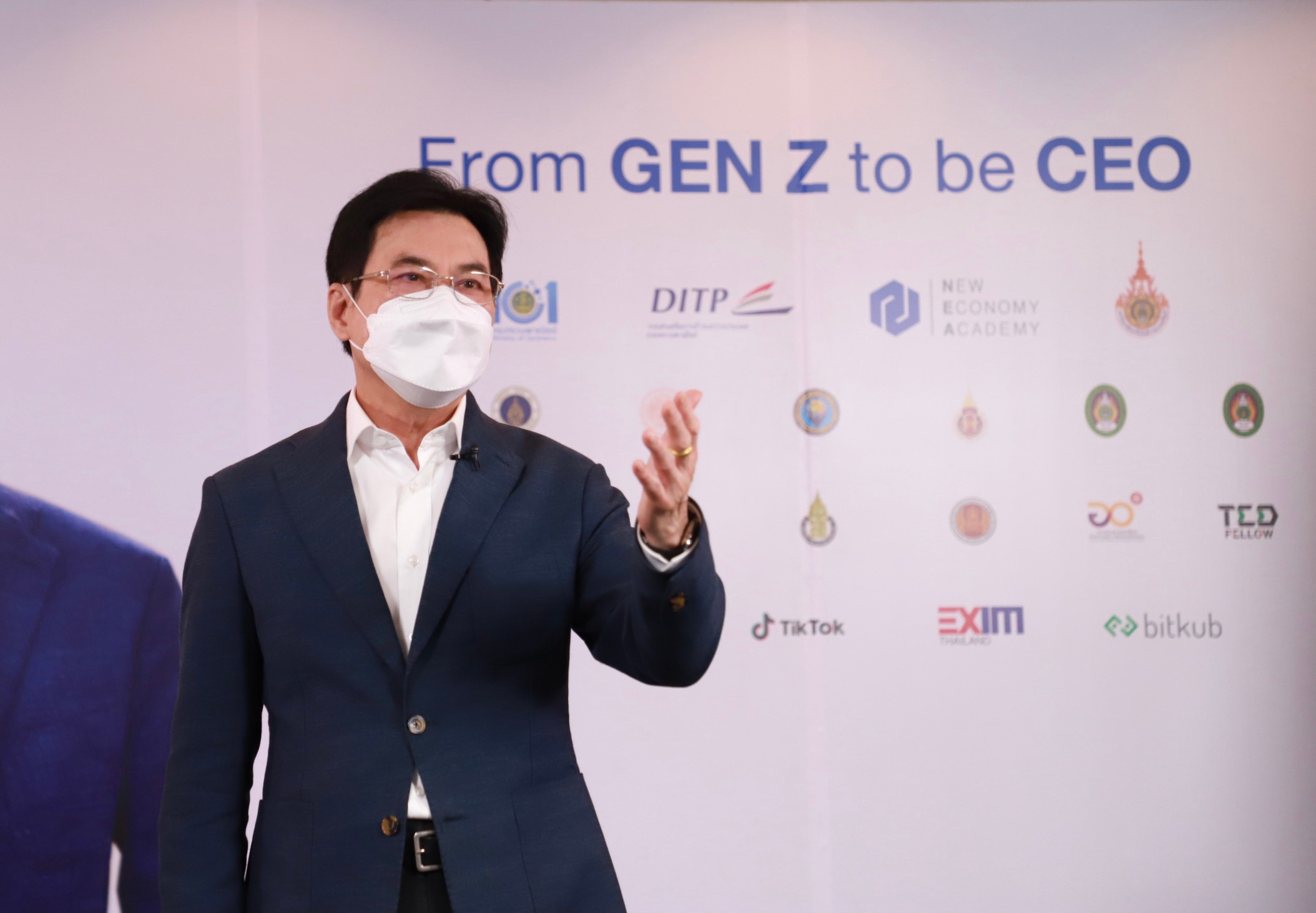 โครงการนี้เกิดขึ้นเพราะเราเดาใจออกว่าพวกเราจำนวนไม่น้อยต้องการเติบโตไปเป็นส่วนหนึ่งของภาคส่วนทางเศรษฐกิจของประเทศโดยตั้งฝันอนาคตไว้ว่าเมื่อมีโอกาสเรียนจบแล้วจะโตไปเป็นนายของตัวเอง ซึ่งส่วนใหญ่ต้องการไปเป็นนายของตัวเองประกอบธุรกิจของตนเองและมีตัวเองเป็นเจ้าของ ที่ผ่านมาประสบความสำเร็จเป็นอย่างยิ่ง ตั้งเป้าหมายว่าภายในปี 2564 กระทรวงพาณิชย์จะปั้น Gen Z ให้เป็น CEO ได้ไม่ต่ำกว่า 12,000 คนแต่ปรากฏว่าจนถึงนาทีนี้มี Gen Z สมัครเข้ามาแล้วถึง 20,000 คน สูงกว่าเป้าถึง 8,000 คน อบรมไปแล้วรไม่รวมวันนี้ 14,000 คนและวันนี้อีก 1,500 คน จากมหาวิทยาลัยเทคโนโลยีราชมงคลธัญบุรี และพื้นที่ใกล้เคียง ในปีนี้กระทรวงพาณิชย์มั่นใจว่าเราสามารถสนองความต้องการของ Gen Z ได้ทั้งหมด 20,000 คน จากเป้าหมาย 12,000 คน และที่ผ่านมากระทรวงพาณิชย์ มีหลักสูตรเพิ่มทักษะศักยภาพให้กับผู้ประกอบการอีกหลายรุ่น รวมกันทั่วทั้งประเทศด้วยหลายหลักสูตรด้วยกัน โดยสถาบันพัฒนาผู้ประกอบการยุคใหม่ (NEA) ทำมาแล้วในช่วงที่ตนเข้ามาเป็นรัฐมนตรีว่าการถึง 67,000 คน รวม Gen Z ที่อบรมไปแล้วจนถึงวันนี้อีก 16,000 คน รวมสามารถดำเนินการไปแล้วถึง 83,000 คน