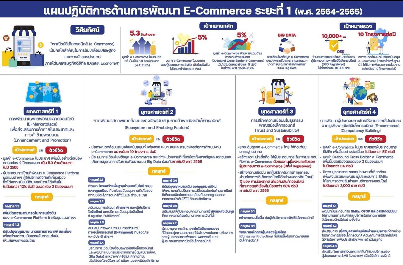ในรายละเอียดเพิ่มเติม นายนันทพงษ์ จิระเลิศพงษ์ รองอธิบดีกรมส่งเสริมการค้าระหว่างประเทศ เปิดเผยว่า แผนปฏิบัติการด้านการพัฒนาพาณิชย อิเล็กทรอนิกส์ ระยะที่ 1 (พ.ศ.2564-2565) ประกอบด้วย 4 ยุทธศาสตร์ 1. การพัฒนาแพลตฟอร์มตลาดออนไลน์ (e-Marketplace) เพื่อส่งเสริมการค้าภายในประเทศและการค้าข้ามพรมแดน (Enhancement and Promotion) 2. การพัฒนาสภาพแวดล้อมและปัจจัยสนับสนุนการค้าพาณิชย์อิเล็กทรอนิกส์ในทุกด้านให้พร้อมรองรับการเติบโตของการค้าพาณิชย์อิเล็กทรอนิกส์ (Ecosystem and Enabling Factors) 3.การสร้างความเชื่อมั่นในธุรกรรมพาณิชย์อิเล็กทรอนิกส์ (Trust and Sustainability) 4. การพัฒนาผู้ประกอบการไทยให้สามารถใช้ประโยชน์จากธุรกิจพาณิชย์อิเล็กทรอนิกส์ (Competency Building) พร้อมทั้งรองรับการเติบโตของพาณิชย์อิเล็กทรอนิกส์ ครอบคลุมการก้าวเข้าสู่ชีวิตวิถีใหม่ (New Normal) และสอดรับกับสถานการณ์ในปัจจุบัน